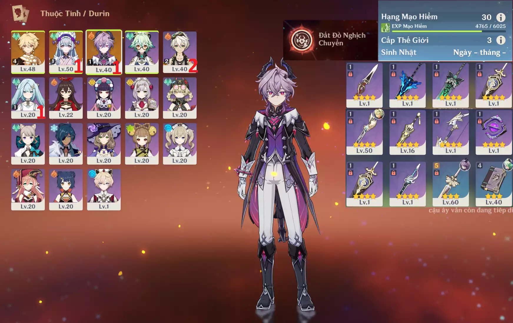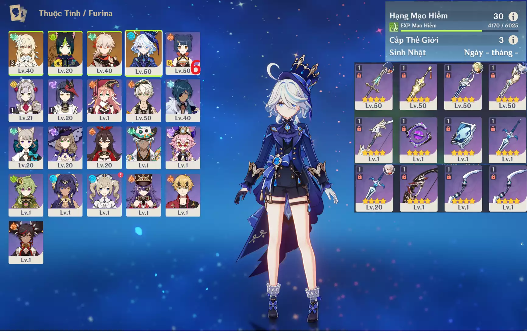 #360826 500,000đ 500,000đ AR level 30 Khu Vực asia Tướng 5* 3 Ar30 : Furina + Kazuha + Tighnari _ banner nhân vật 35/90 ( chưa set sinh nhật ) _ map zin 90% Tướng : 3 Vũ khí : 0 Chi tiết