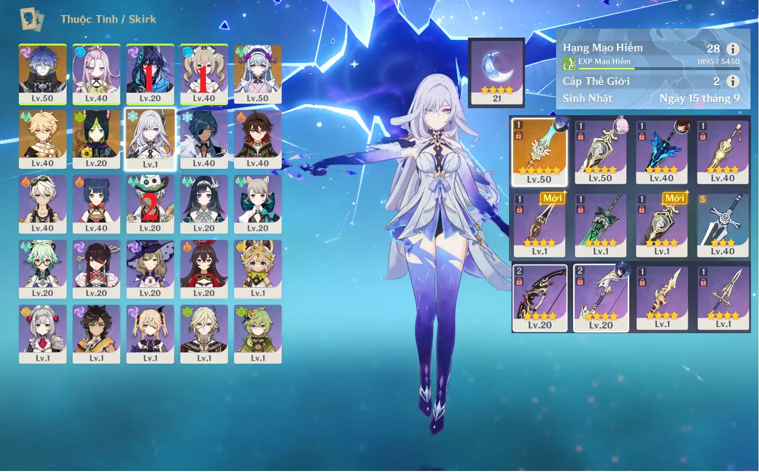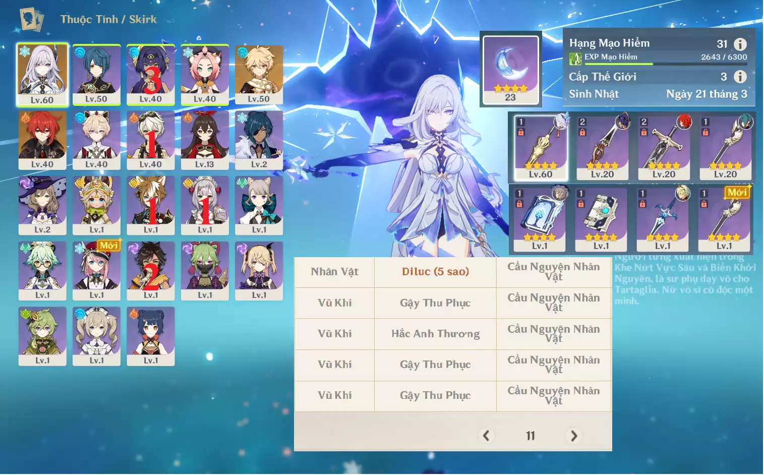 VIP ar10: Skirk TRẤN - Kazuha- Baal HPD - Yelan - Yaemiko - Qiqi - Tighnari - Dehya - Diluc C1 .. Acc chưa set sinh nhật, banner nv lệch 10/90