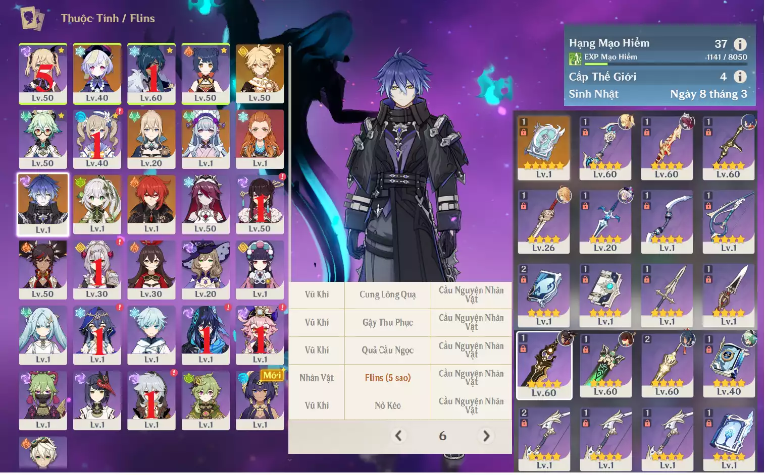 Ar37: Flins + Nahida ĐTTP* + Mizuki Diluc Jean QiQi bennet main NAM , banner nhân vật 6 trang + 4 roll hồng, chưa set user