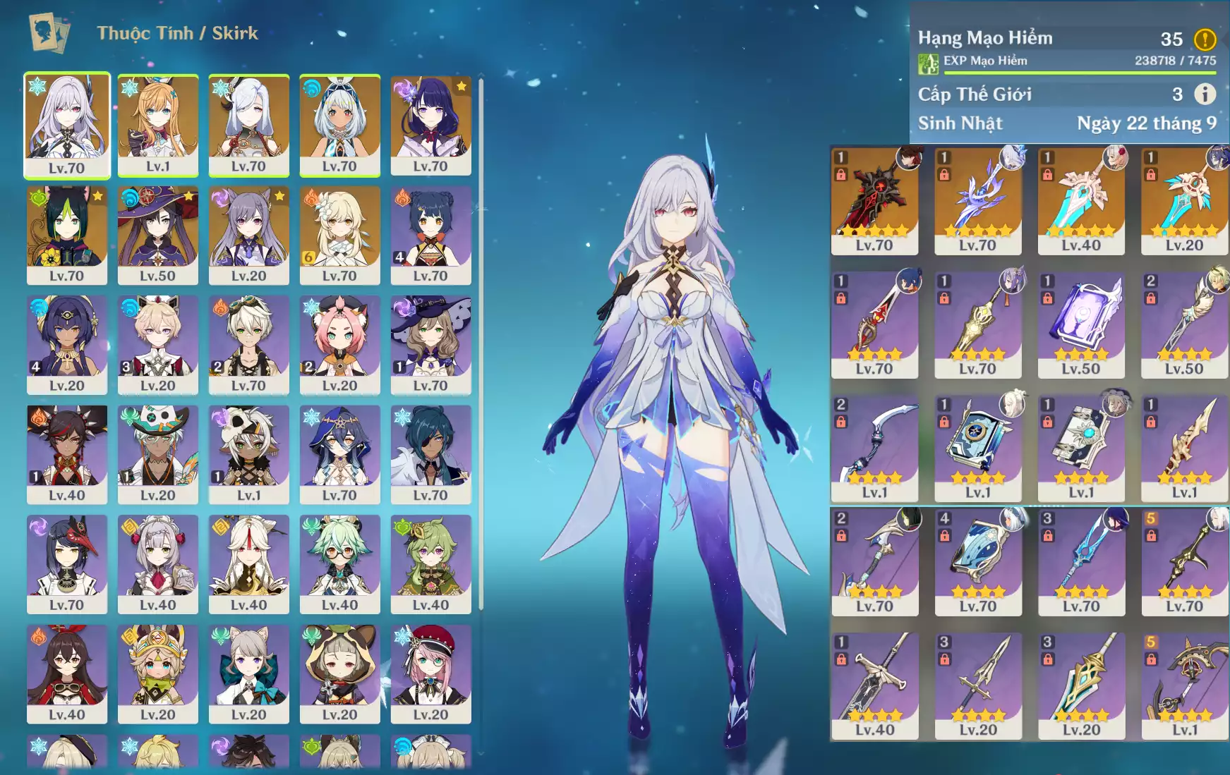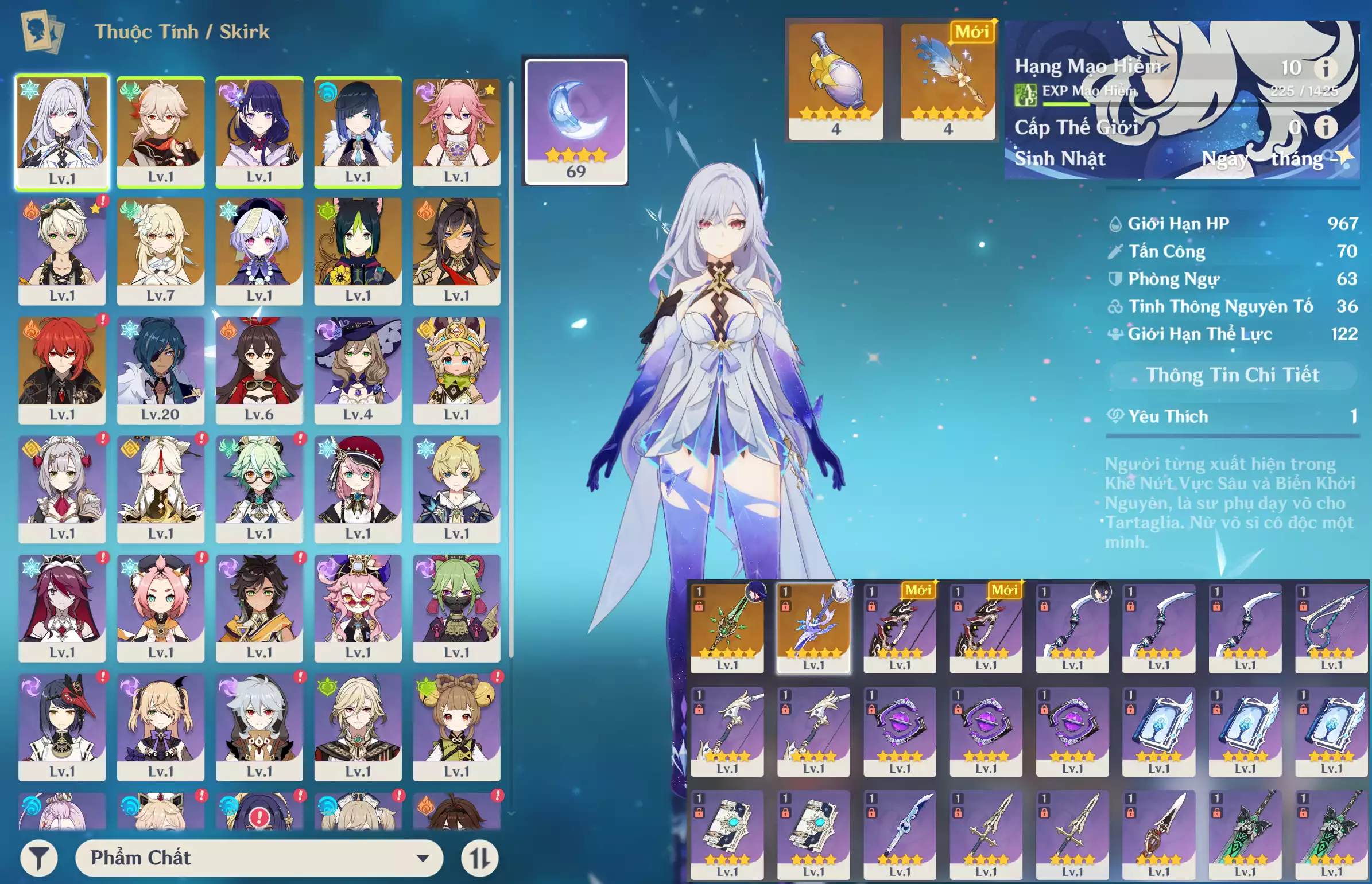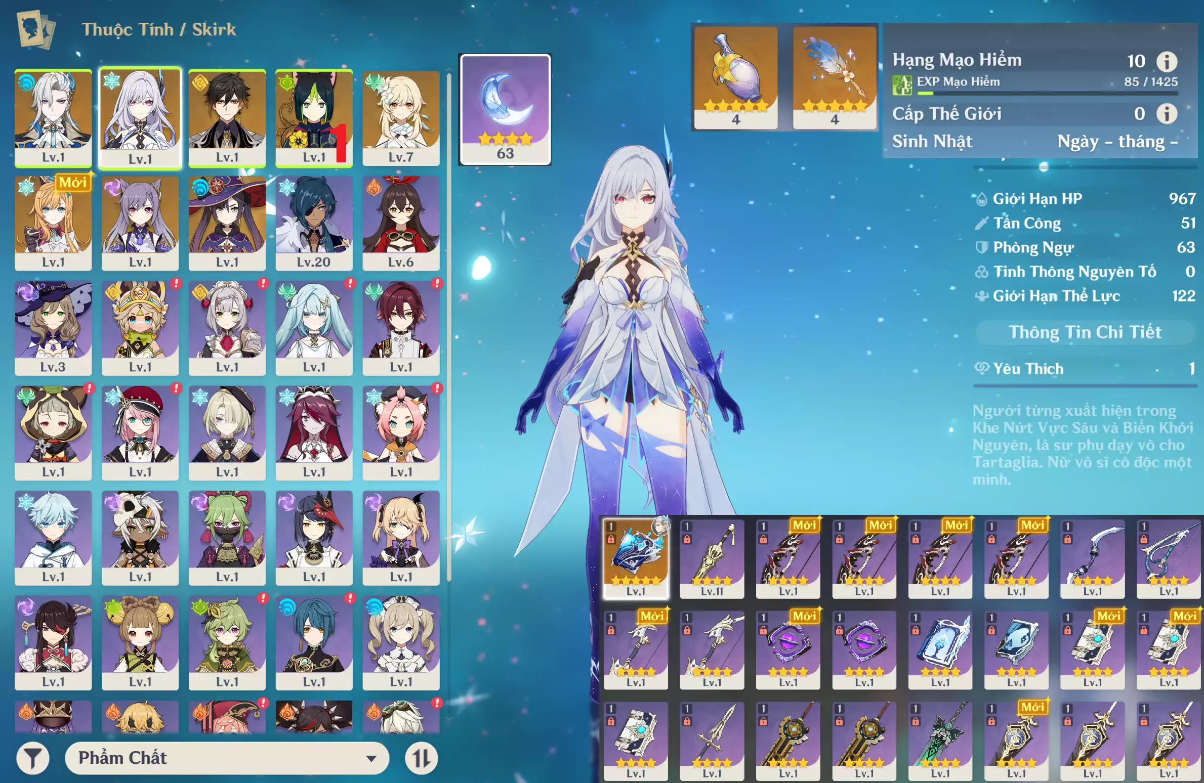 VIP ar10: Skirk - Escoffier - Neuvillette TRẤN - Zhongli - Tighnari C1 - Keqing - Mona ... Acc chưa set sinh nhật, banner vũ khí 41/70