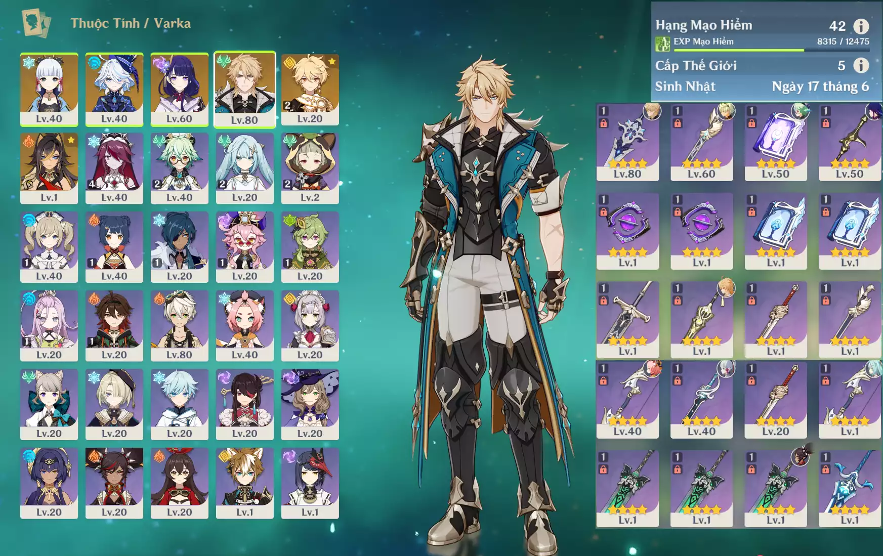 Ar42 : Varka + Raidenshogun-baal + Furina + Ayaka + Dehya _ banner nhân vật 2 trang ( chưa set email ) _ map zin hơn 80%