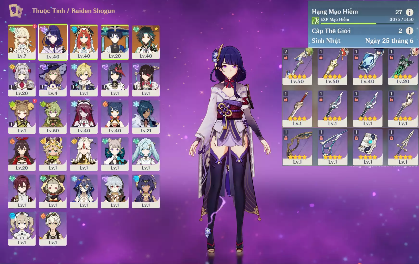 Ar27 : Raidenshogun-baal + Scaramouche + Xiao + Nilou _ banner nhân vật 75/90 lần ( chưa set email ) _ map zin 99%