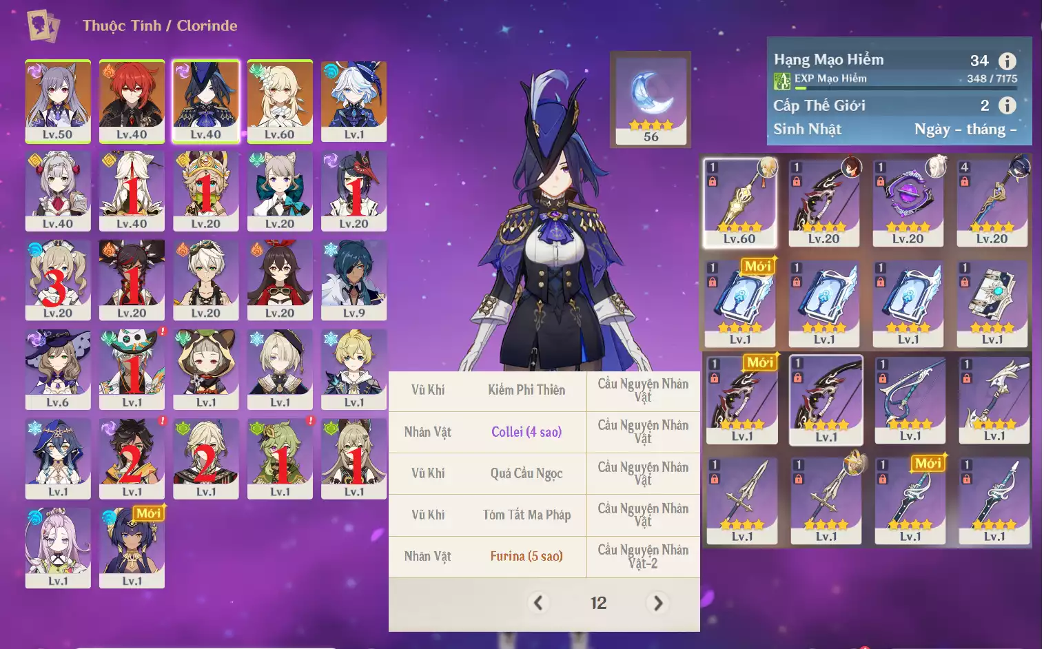 Ar34: Clorinde + Furina + Diluc Keqing bennet , banner nhân vật 12 trang + 4roll hồng, chưa set user _ chưa set sinh nhật
