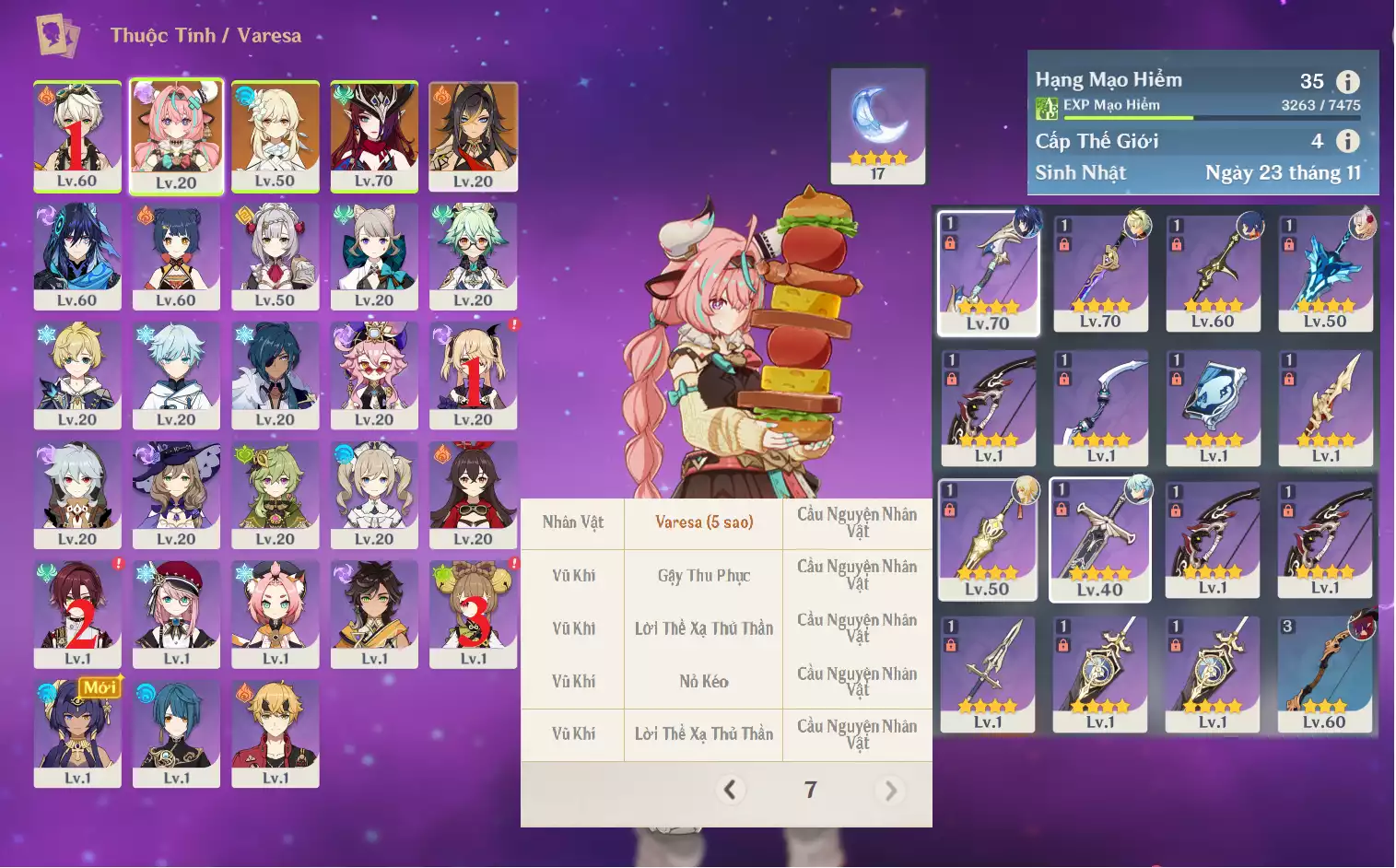 Ar35: Varesa + Chasca + Dehya bennetC1 , banner nhân vật 8 trang , chưa set user