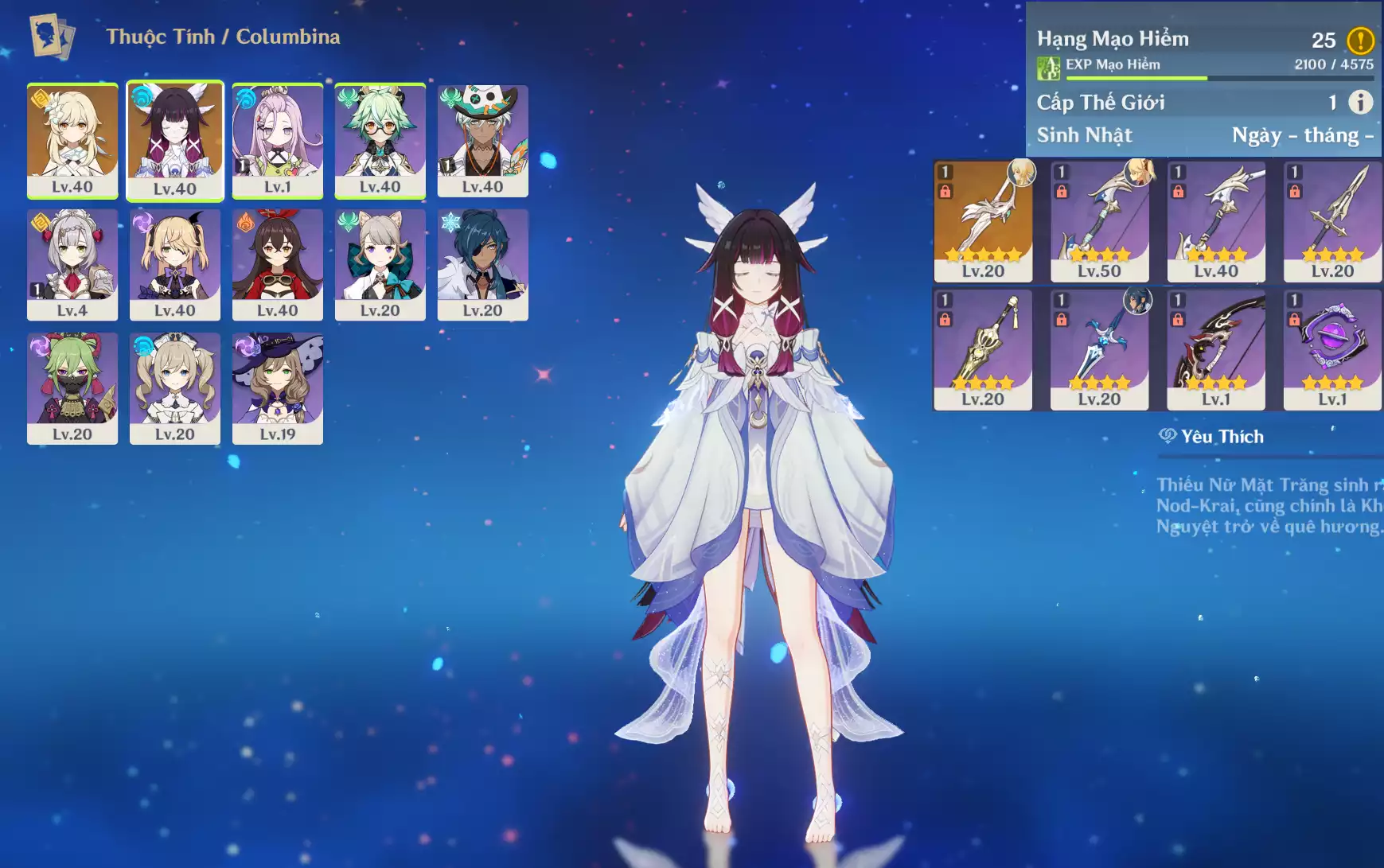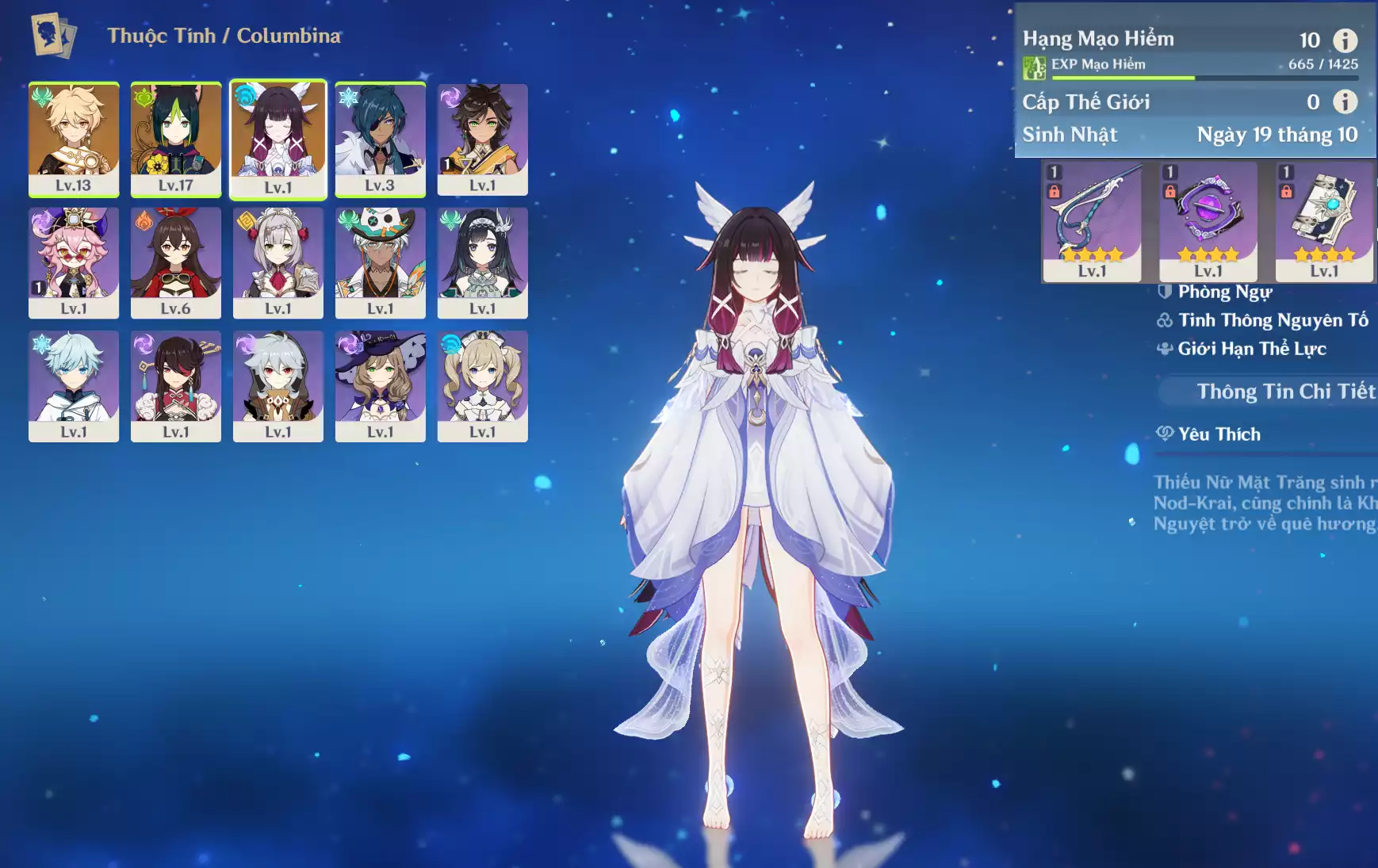 #360641 500,000đ 500,000đ AR level 10 Khu Vực asia Tướng 5* 2 Ar10 : Nguyệt thần Columbina + Tighnari _ banner nhân vật 1 trang ( chưa set user ) Tướng : 2 Vũ khí : 0 Chi tiết