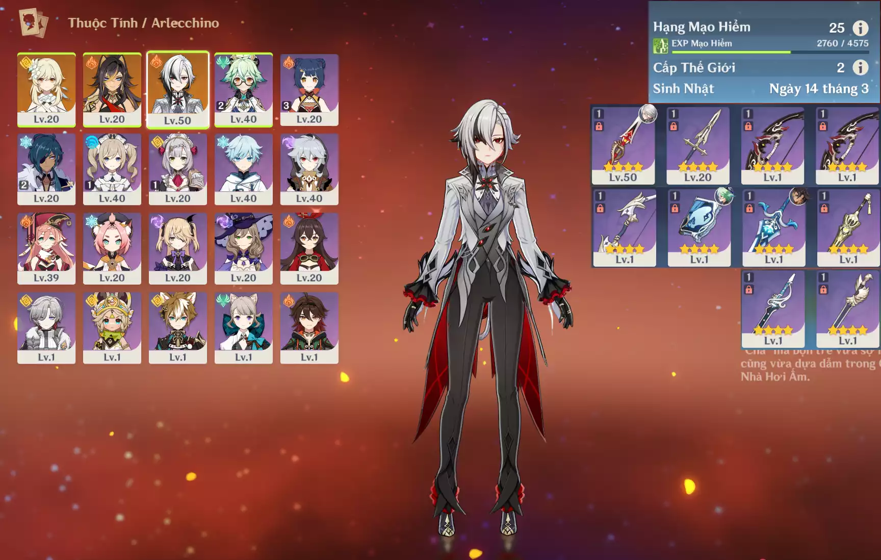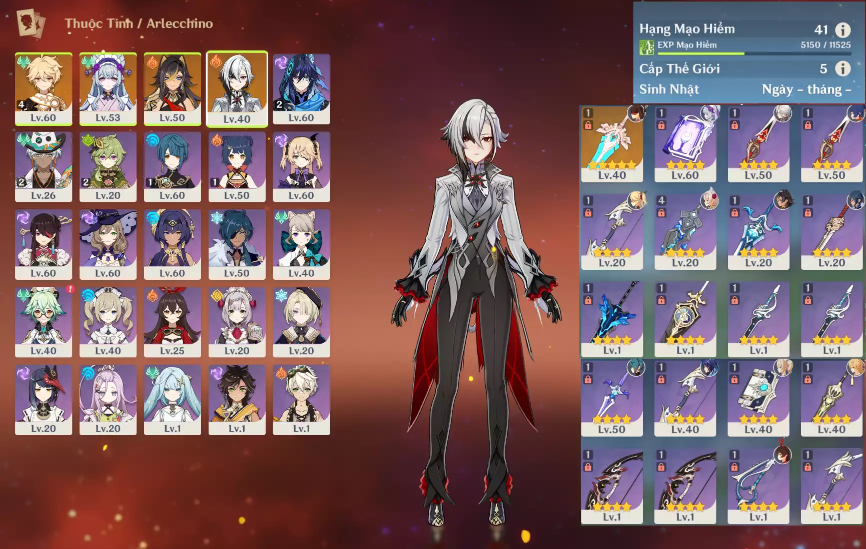 #360648 399,000đ 399,000đ AR level 25 Khu Vực asia Tướng 5* 2 Ar25 : Arlecchino + Dehya_ banner nhân vật 50/90 lần ( chưa set user ) _ map zin gần 99% Tướng : 2 Vũ khí : 0 Chi tiết