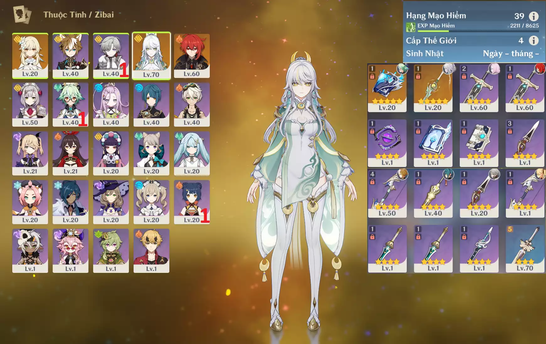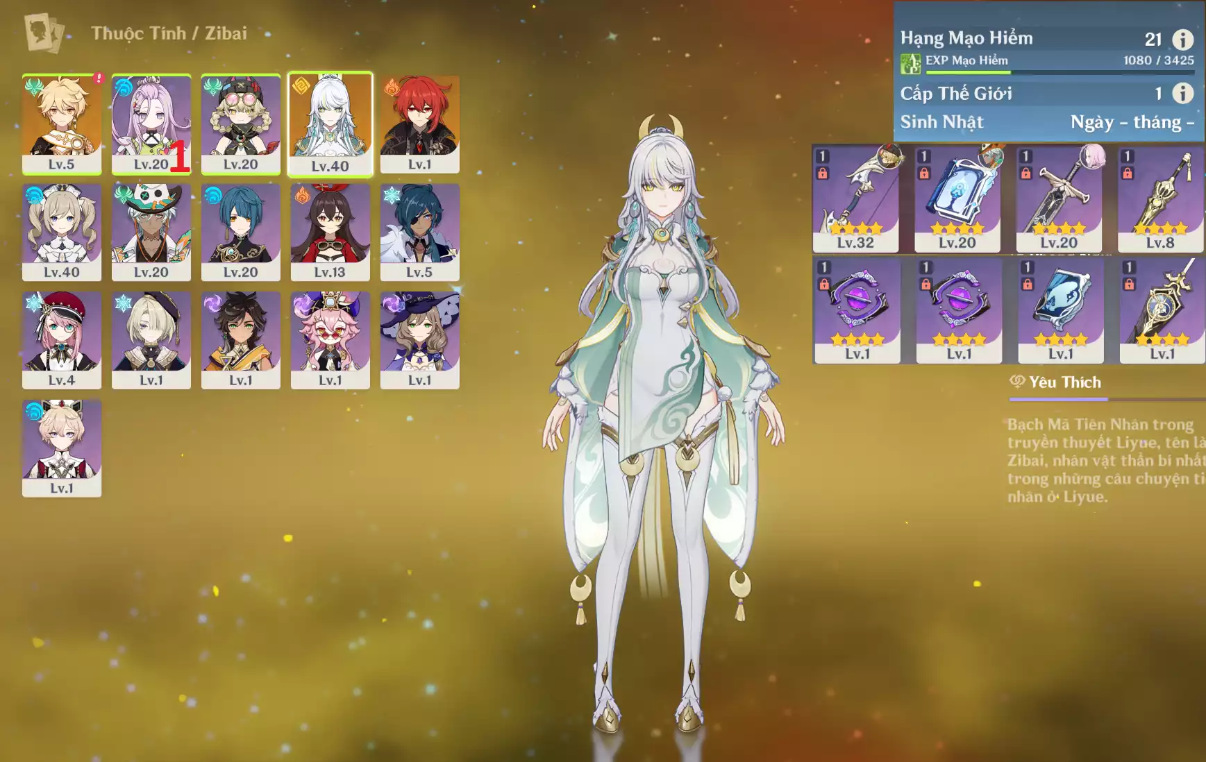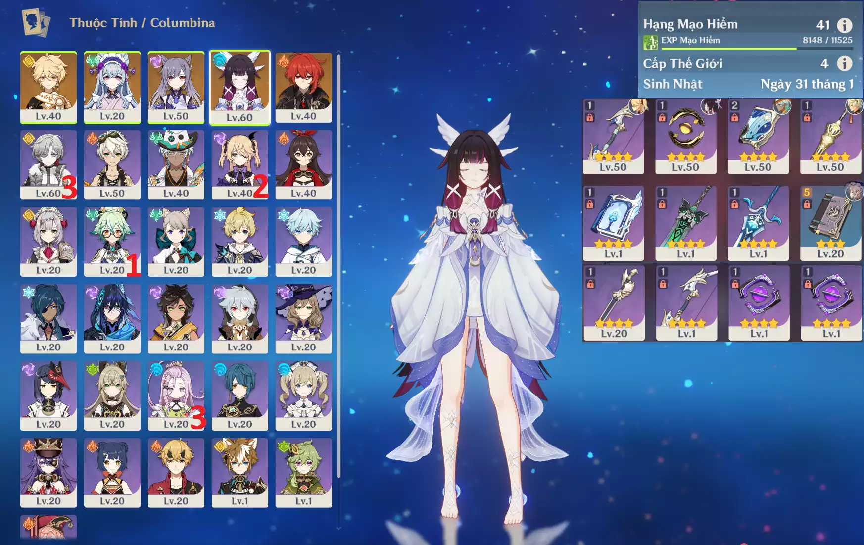 #360056 300,000đ 300,000đ AR level 41 Khu Vực asia Tướng 5* 4 Nguyệt thần Columbina + Diluc + Keqing + Mizuki _ banner nhân vật ĐÃ LỆCH 1 trang ( chưa set user ) _ map zin gần 80% Tướng : 4 Vũ khí : 0 Chi tiết