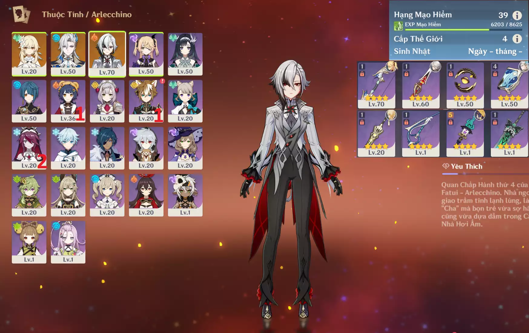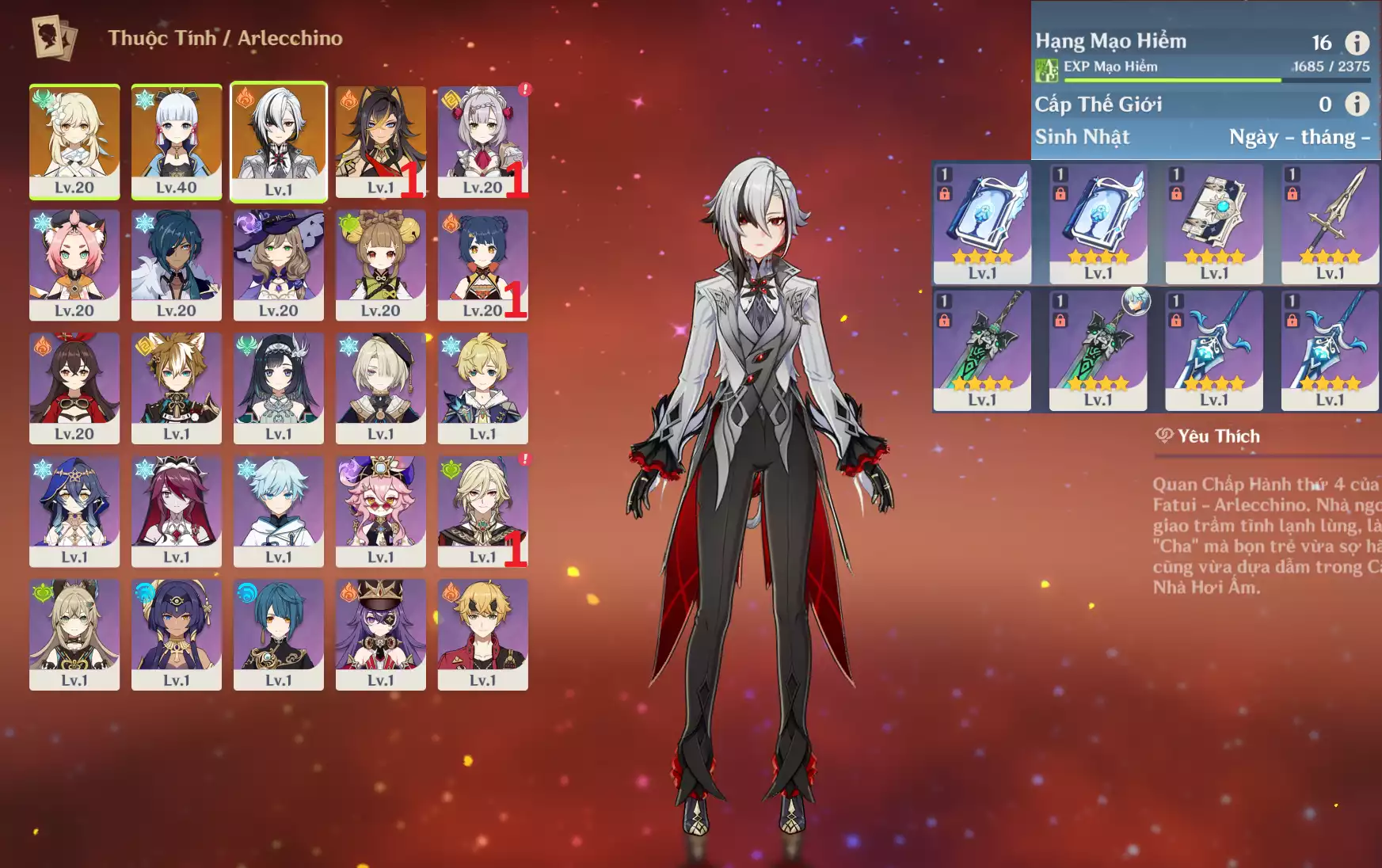 #359884 1,000,000đ 1,000,000đ AR level 7 Khu Vực asia Tướng 5* 4 Ar7 : Arlecchino + Clorinde + Xianyun + Tighnari _ banner nhân vật 30/90 ( chưa set user + sinh nhật ) Tướng : 4 Vũ khí : 0 Chi tiết