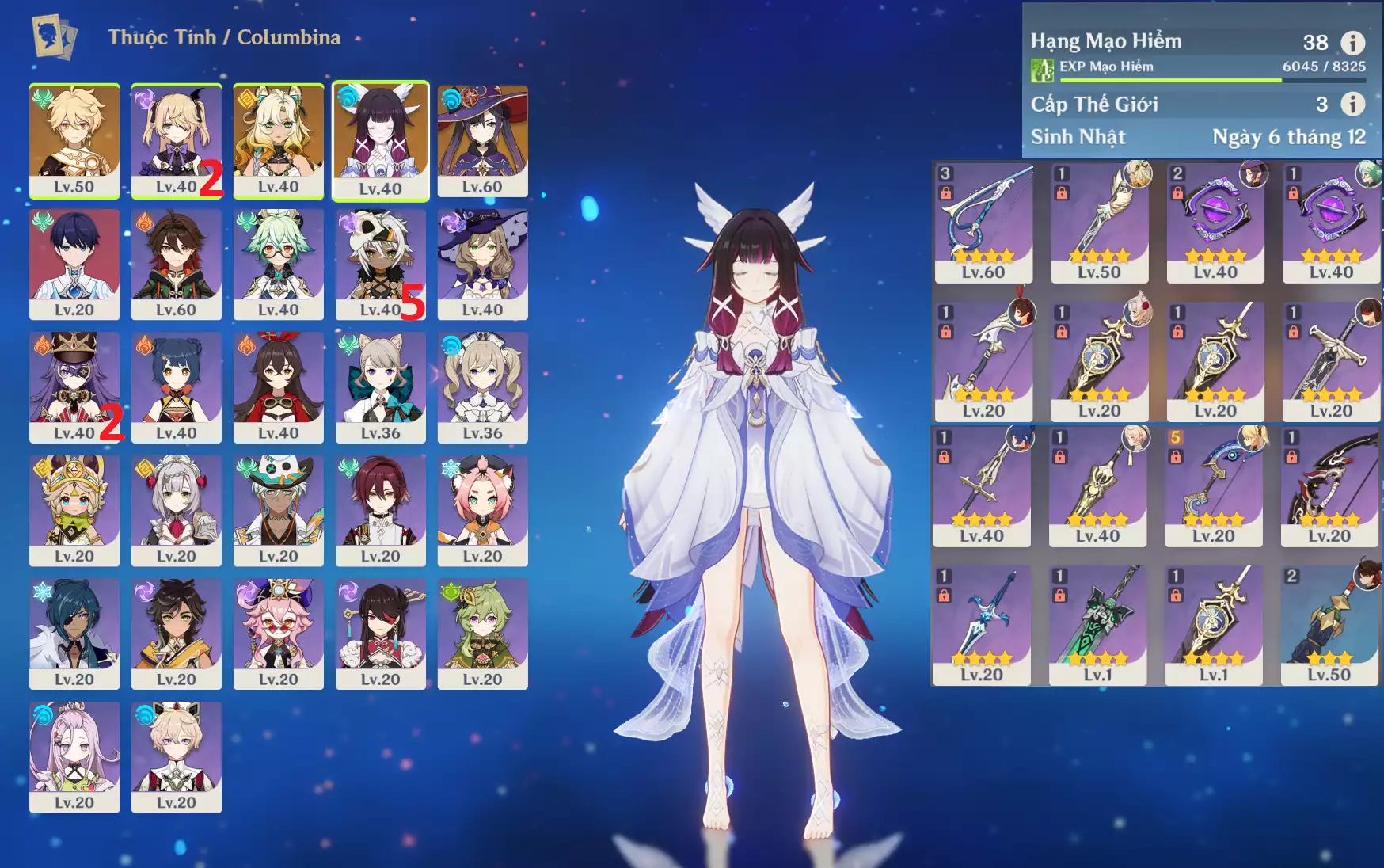 #360057 4,000,000đ 4,000,000đ AR level 25 Khu Vực asia Tướng 5* 6 Ar25 : Columbina + Ineffa + Durin * Trấn ( HAXT ) + Neuvilette Skin * Trấn ( NTDCVH ) _ banner nhân vật 1 trang ( chưa set sinh nhật ) - thẻ tháng 25 ngày từ 24/2/2026. Tướng : 6 Vũ khí : 2 Chi tiết