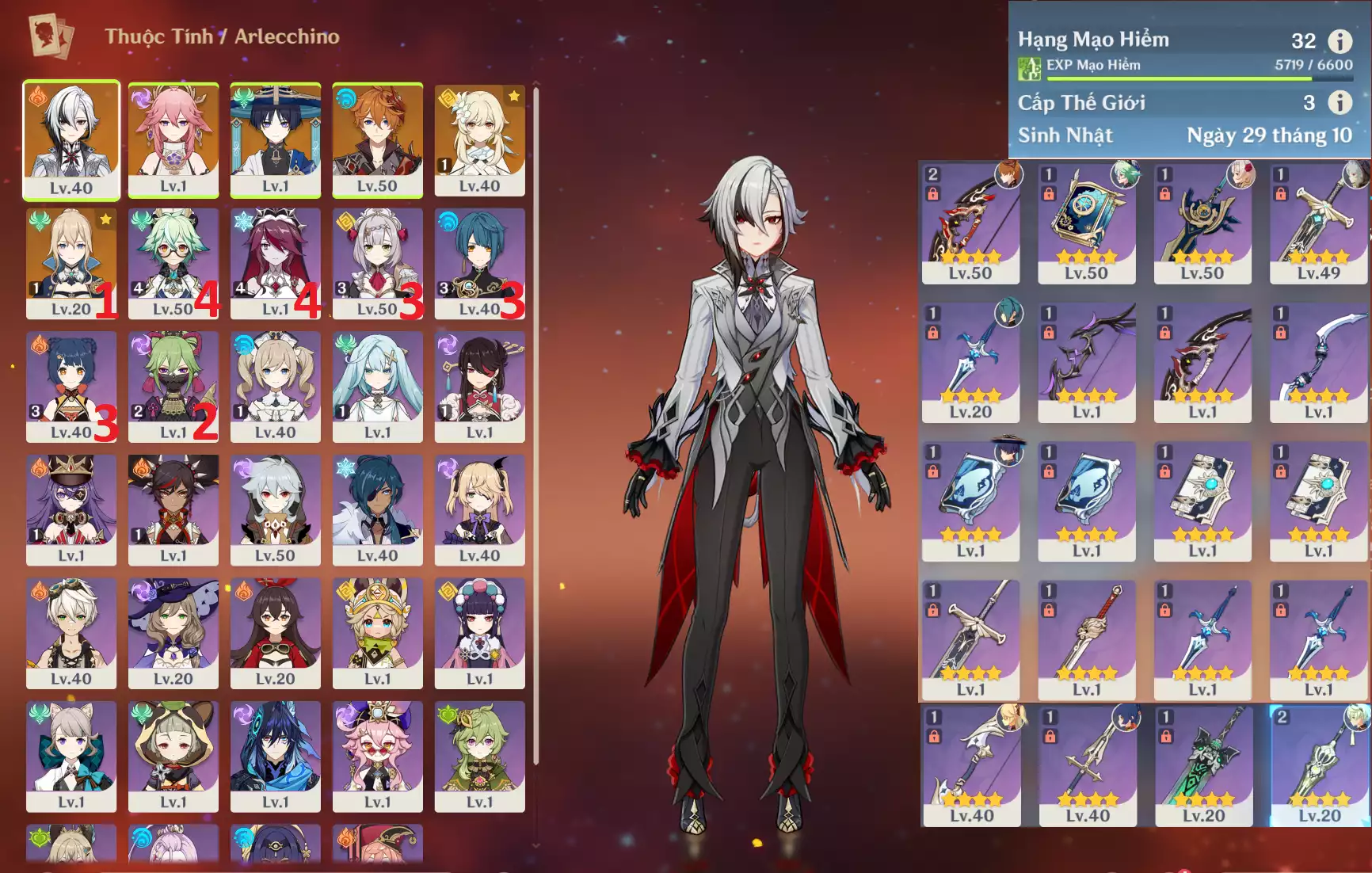 #360537 800,000đ 800,000đ AR level 32 Khu Vực asia Tướng 5* 6 Ar32 : Arlecchino + Scaramouche + Yaemiko + Childe + JeanC1 _ banner nhân vật 65/90 lần _ map zin 99% Tướng : 6 Vũ khí : 0 Chi tiết