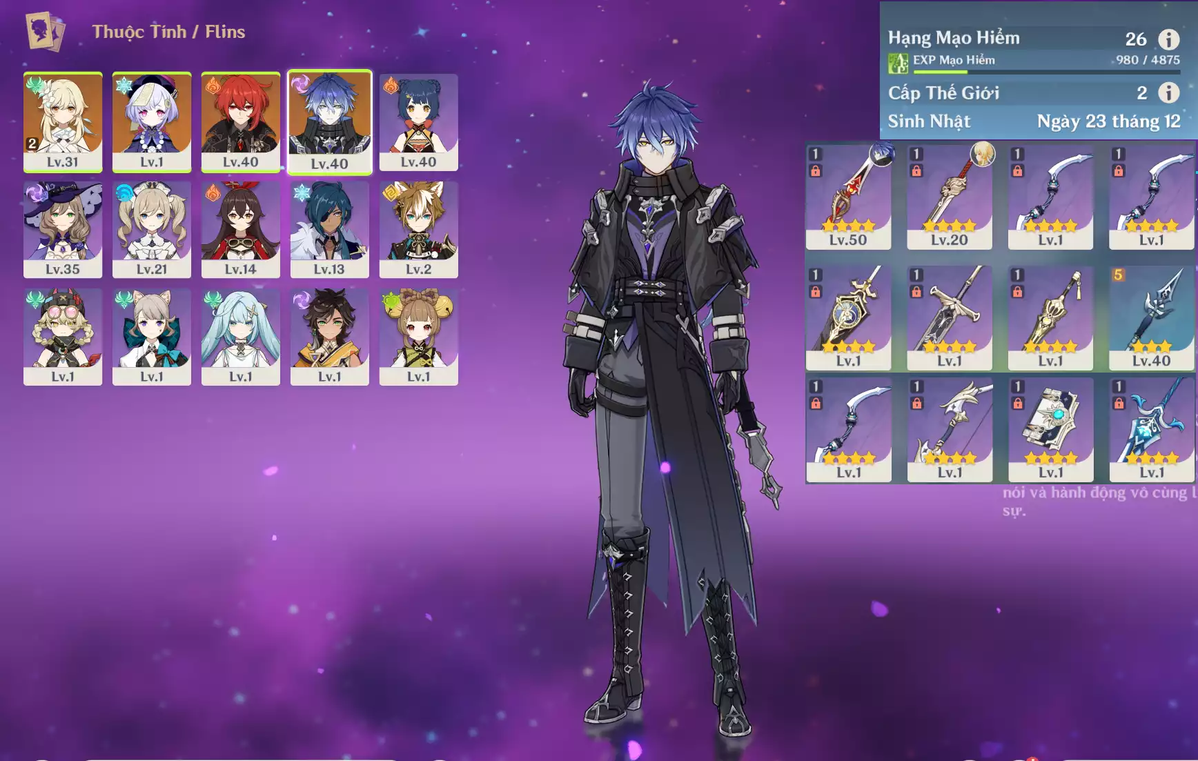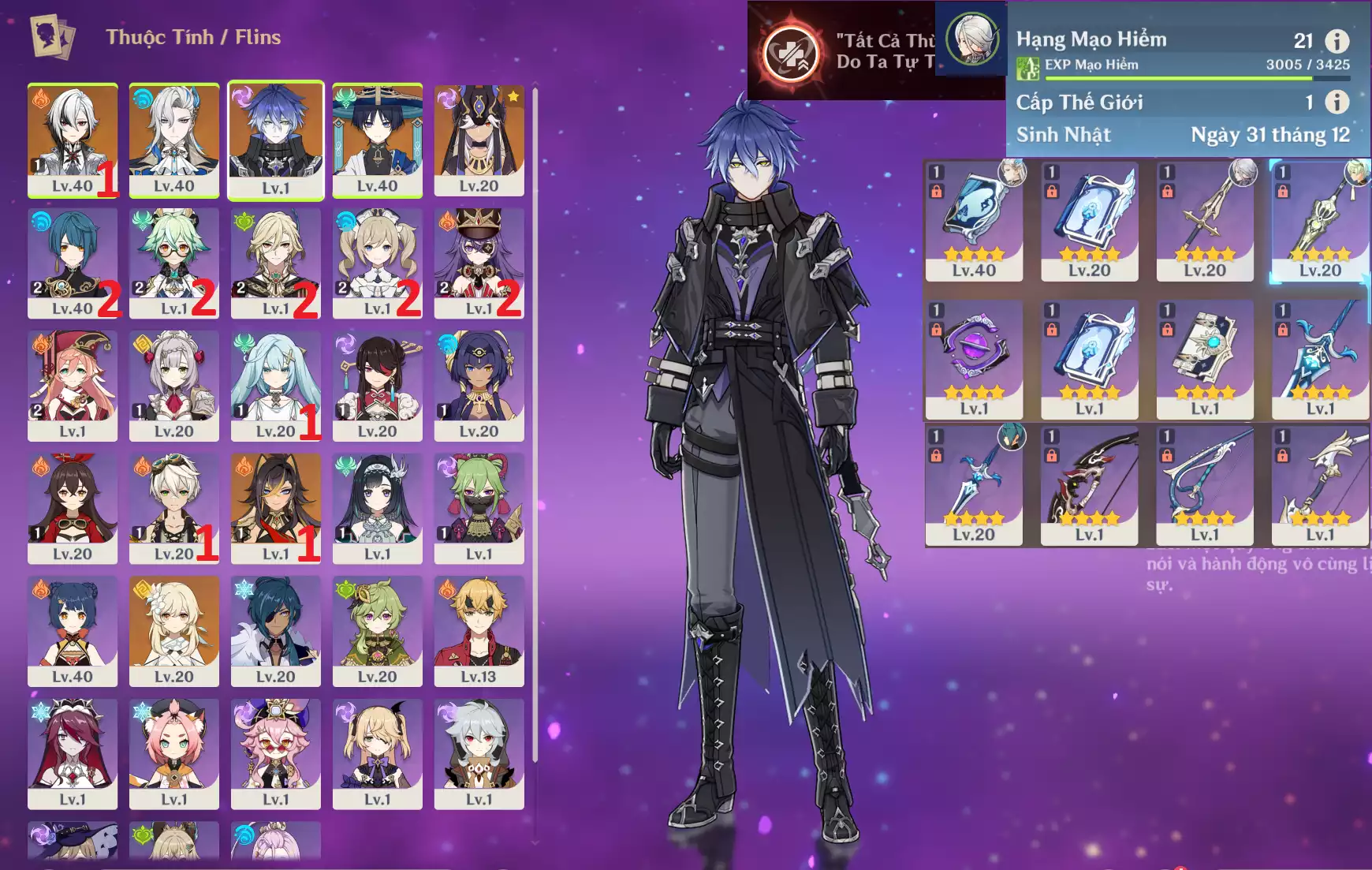 #360538 1,800,000đ 1,800,000đ AR level 21 Khu Vực asia Tướng 5* 7 Ar21 : ArlecchinoC1+ Neuvillette + Flins + Scaramouche + Cyno + DehyaC1 _ banner nhân vật 1 trang _ map zin 99% Tướng : 7 Vũ khí : 0 Chi tiết