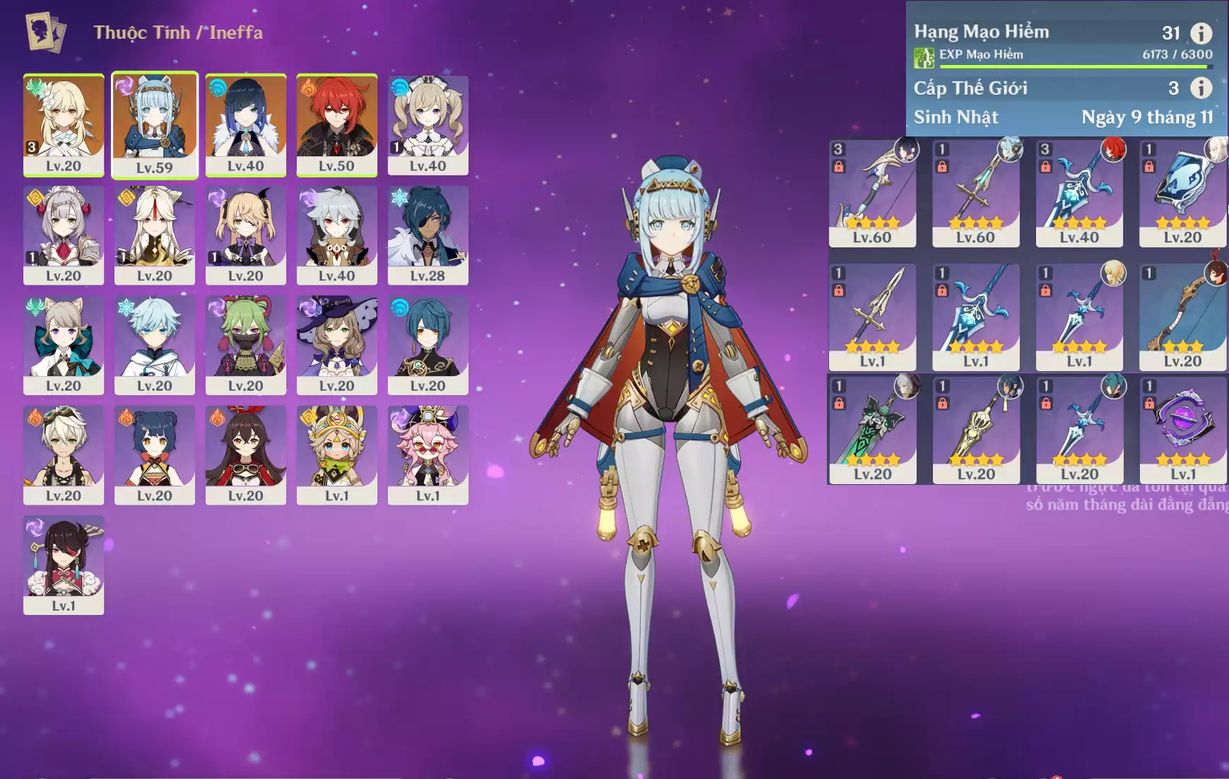 #360542 650,000đ 650,000đ AR level 31 Khu Vực asia Tướng 5* 3 Ar31 : Ineffa + Yelan + Diluc _ banner nhân vật 60/90 ( chưa set user ) _ map zin 99% Tướng : 3 Vũ khí : 0 Chi tiết