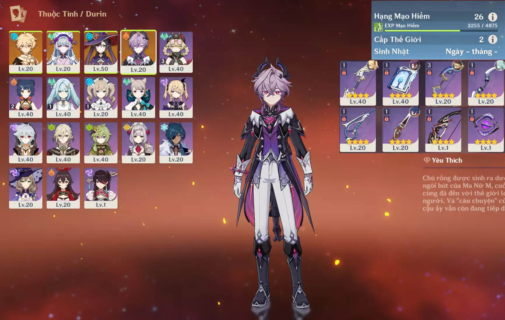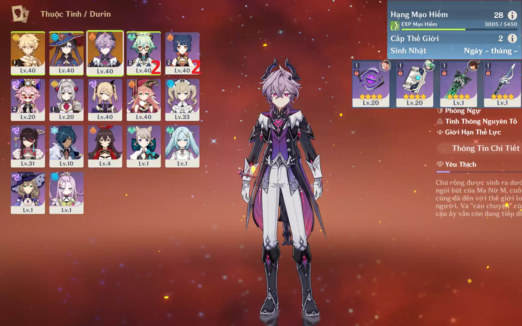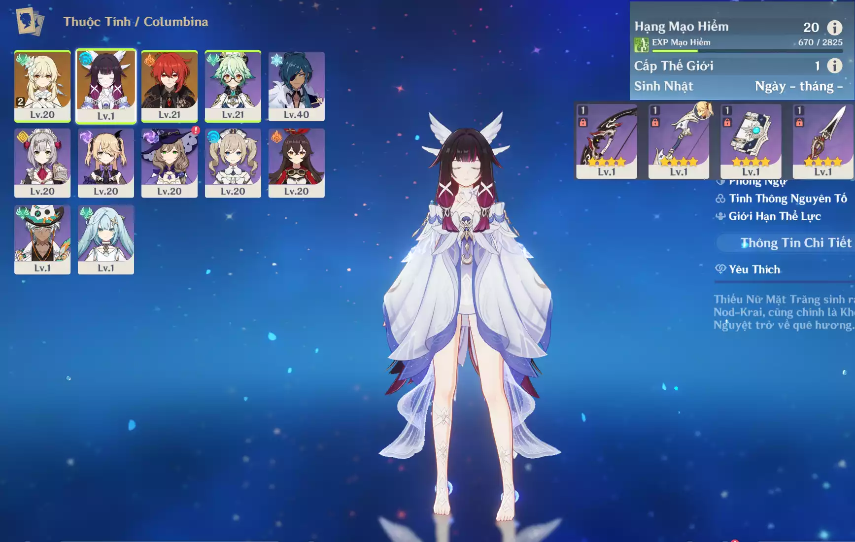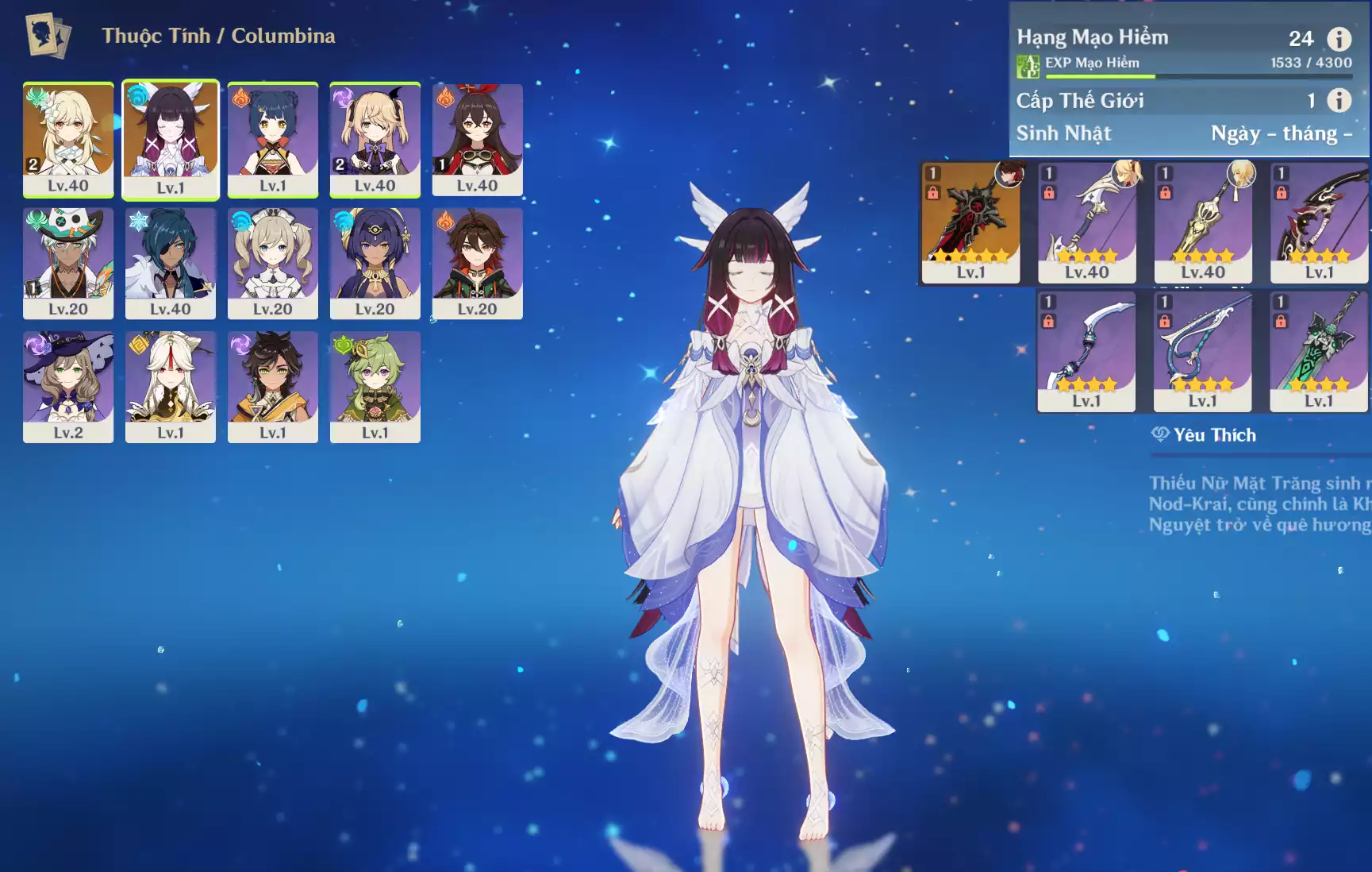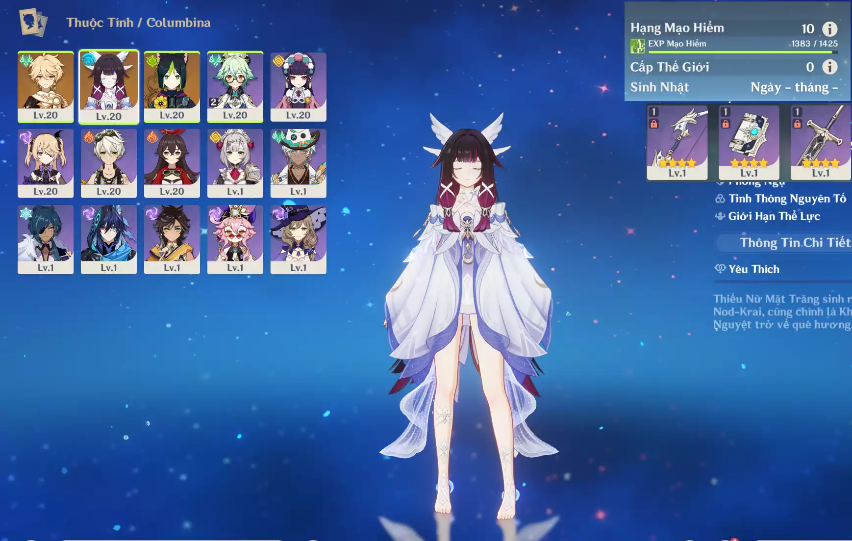 #360567 500,000đ 500,000đ AR level 10 Khu Vực asia Tướng 5* 2 Acc khởi đầu Ar10 : Nguyệt thần Columbina + Tighnari _ banner nhân vật 2 trang ( chưa set user + sinh nhật ) Tướng : 2 Vũ khí : 0 Chi tiết