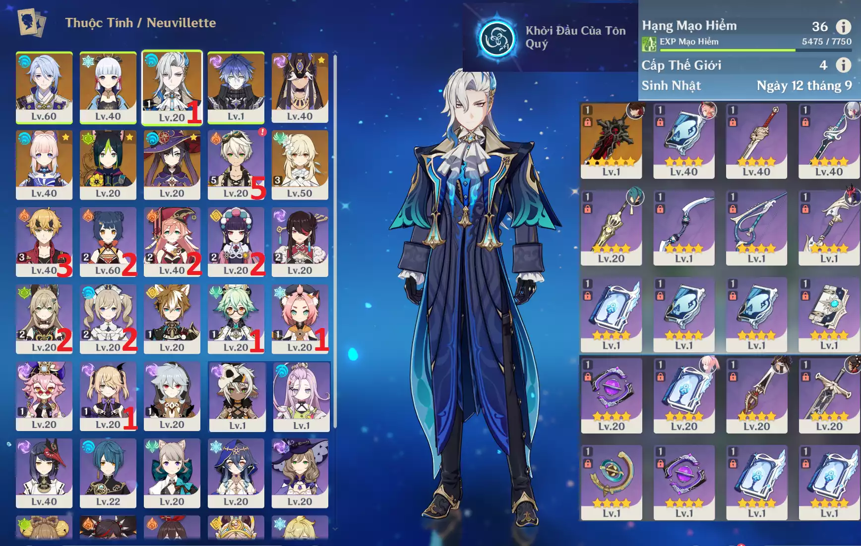#360522 1,200,000đ 1,200,000đ AR level 36 Khu Vực asia Tướng 5* 8 Ar36 : NeuviletteC1 + FLins + Ayato + Ayaka + Kokomi + Cyno + ĐCCS _ banner nhân vật 2 trang ( chưa set user ) _ map zin hơn 95% Tướng : 8 Vũ khí : 1 Chi tiết
