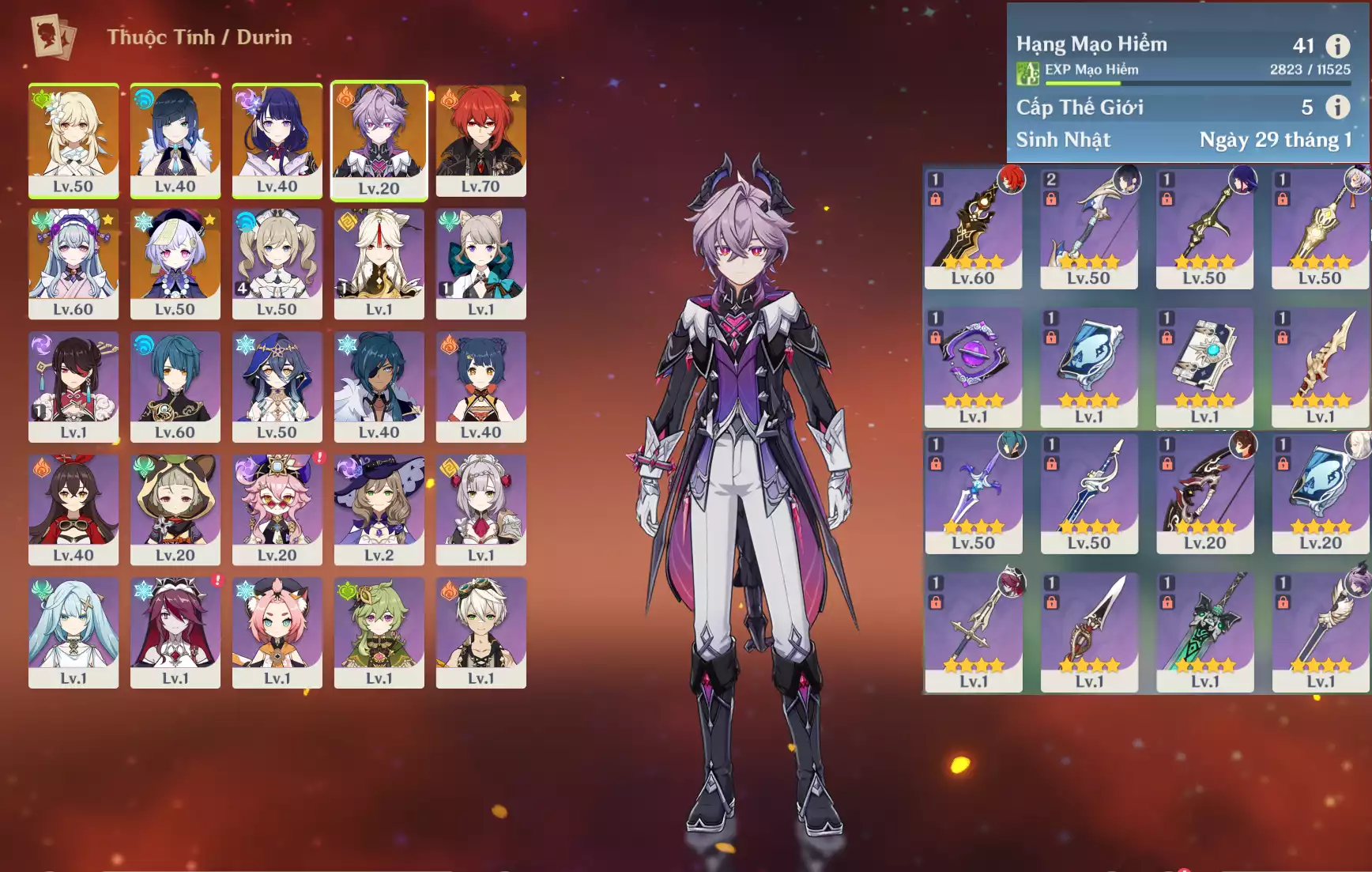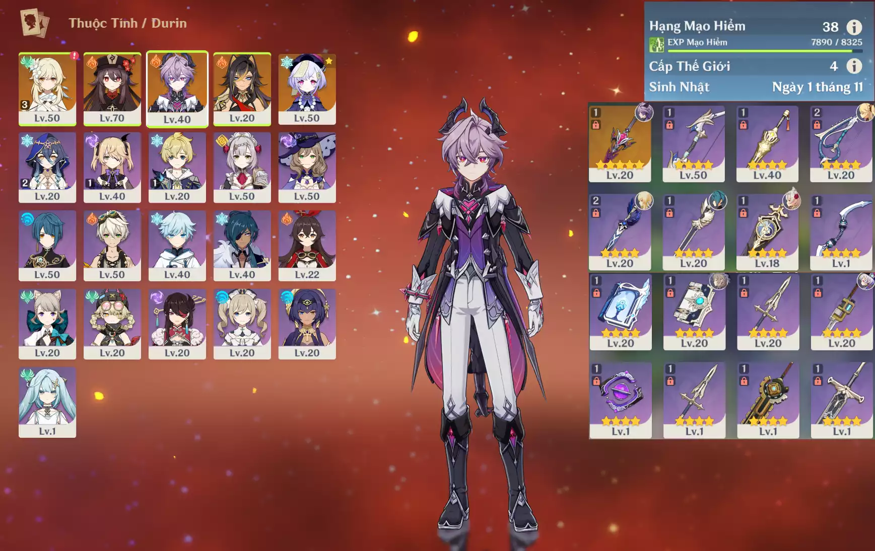 #360530 949,000đ 949,000đ AR level 38 Khu Vực asia Tướng 5* 4 Ar38 : Durin * Trấn ( HAXT ) + Hutao + Dehya + QiQi _ banner nhân vật 5 trang ( chưa set user ) _ map zin hơn 95% Tướng : 4 Vũ khí : 1 Chi tiết