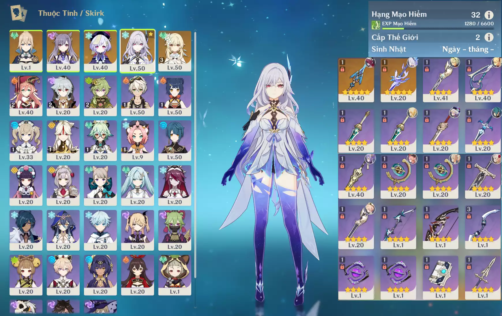 #360529 950,000đ 950,000đ AR level 32 Khu Vực asia Tướng 5* 4 Ar32 : Skirk + Trấn ( Thương Diệu ) + QiQi + Keqing + Jean + HD _ banner nhân vật ĐÃ LỆCH 20/90 ( chưa set sinh nhật, quên user ) Tướng : 4 Vũ khí : 2 Chi tiết