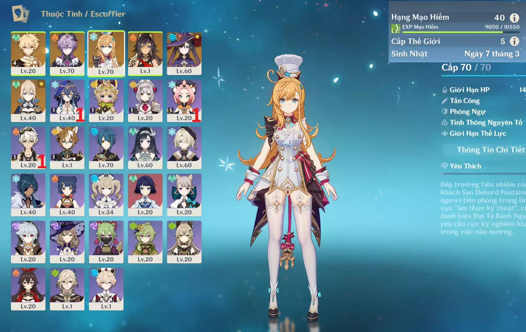 #360531 799,000đ 799,000đ AR level 40 Khu Vực asia Tướng 5* 5 Ar40 : Escoffier * Trấn ( NSHT ) + Durin + Dehya + Mona*ĐTTP + Jean _ banner nhân vật 1 trang ( quên user ) _ map zin hơn 80% Tướng : 5 Vũ khí : 2 Chi tiết