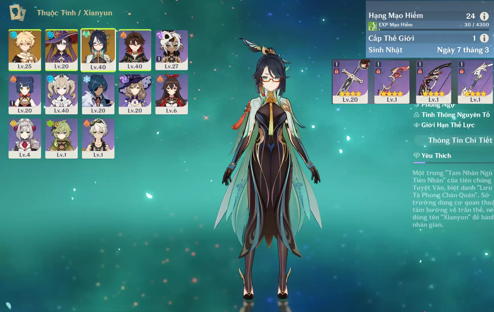 #360512 299,000đ 299,000đ AR level 24 Khu Vực asia Tướng 5* 2 Ar24 : Xianyun + Mona _ banner nhân vật 15/90 ( quên user ) _ map zin gần 90% Tướng : 2 Vũ khí : 0 Chi tiết