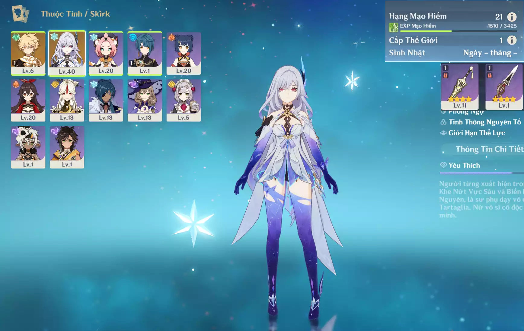 #360514 399,000đ 399,000đ AR level 21 Khu Vực asia Tướng 5* 1 Ar21 : Skirk _ banner nhân vật 1 trang ( chưa set user + sinh nhật ) _ map zin 99% Tướng : 1 Vũ khí : 0 Chi tiết