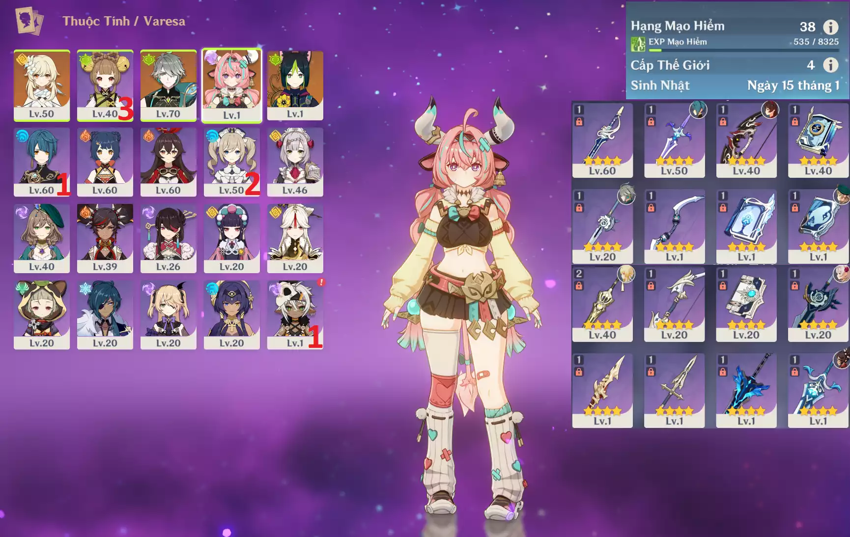#356457 1,000,000đ 1,000,000đ AR level 36 Khu Vực asia Tướng 5* 5 Ar36 : Arlecchino + Trấn ( HTXN ) + Varesa + Mizuki + Mona + Keqing _ banner nhân vật 35/90 ( chưa set sinh nhật ) Tướng : 5 Vũ khí : 1 Chi tiết