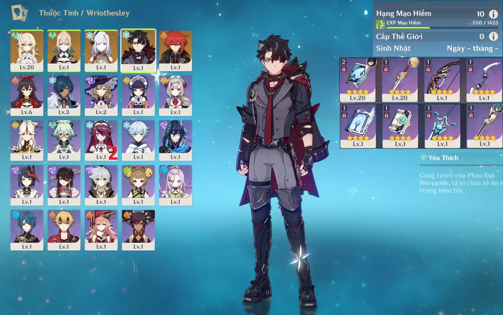 #356451 800,000đ 800,000đ AR level 10 Khu Vực asia Tướng 5* 4 Ar10 : Wriothesley + Shenhe + Diluc + Jean _ banner nhân vật 50/90 lần ( chưa set user + sinh nhật ) _ thẻ tháng 29d từ 13/10/2025 Tướng : 4 Vũ khí : 0 Chi tiết