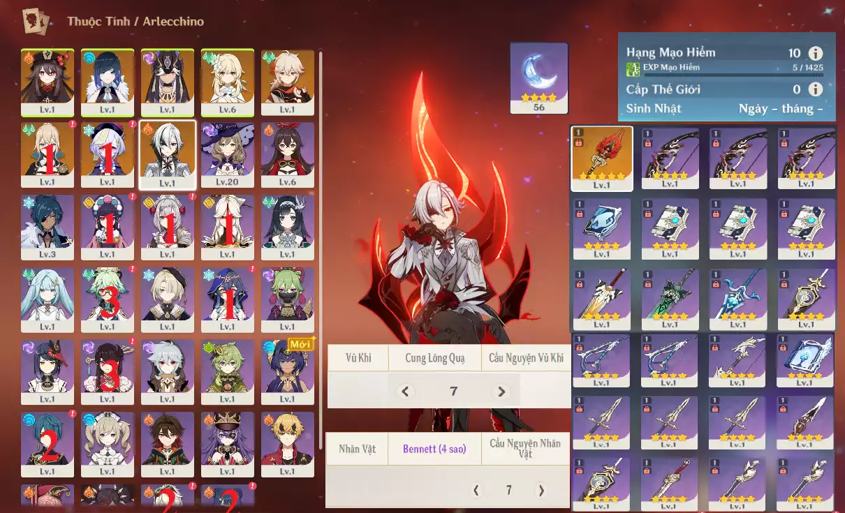 SIÊU PHẨM Ar10: ARLECCHINO + HUTAO Trấn Hộ Ma + YELAN + KAZUHA + CYNO + JeanC1 QiQic1 bennetC2_xingqiuC2 ( banner nhân vật 15 trang roll là nổ, banner vũ khí 35/80 ) , chưa set sinh nhật , nguồn CN k lo back