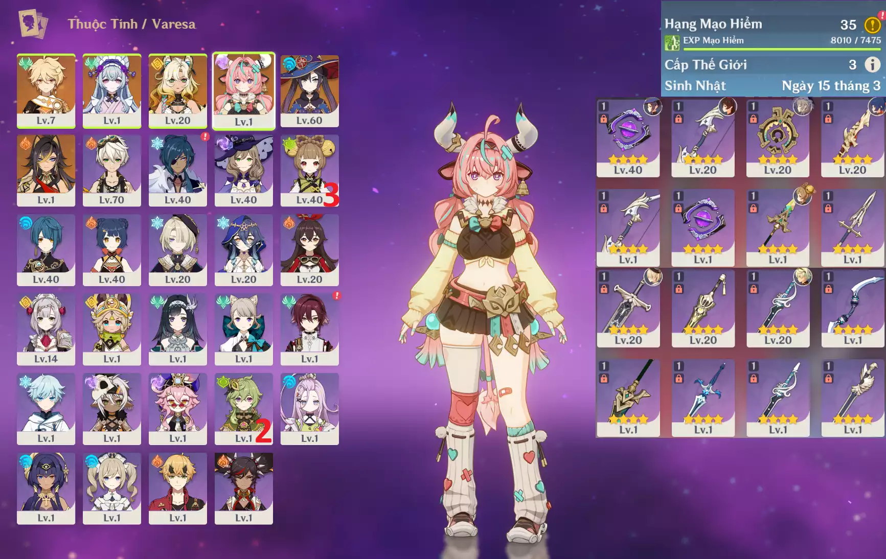 #356385 599,000đ 599,000đ AR level 35 Khu Vực asia Tướng 5* 5 Ar35 : Varesa + Xilonen + Mizuki + Dehya + Mona _ banner nhân vật 20/90 ( chưa set user ) _ map zin 99% Tướng : 5 Vũ khí : 0 Chi tiết
