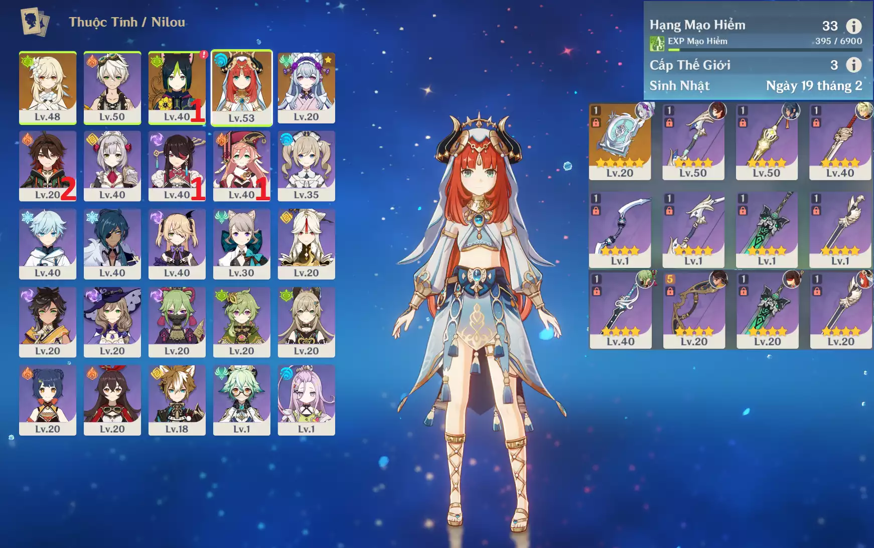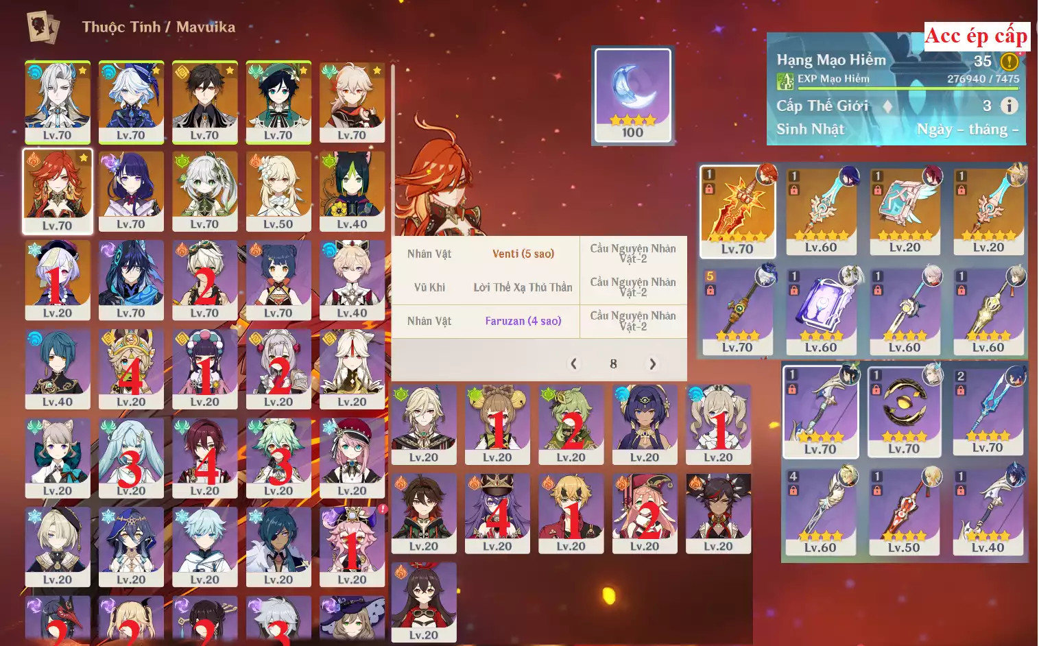 #356386 300,000đ 300,000đ AR level 33 Khu Vực asia Tướng 5* 3 Ar33 : Nilou + TighnariC1 + Mizuki + ĐTTP _ banner nhân vật 50/90 ( chưa set user ) _ map zin 99% Tướng : 3 Vũ khí : 1 Chi tiết