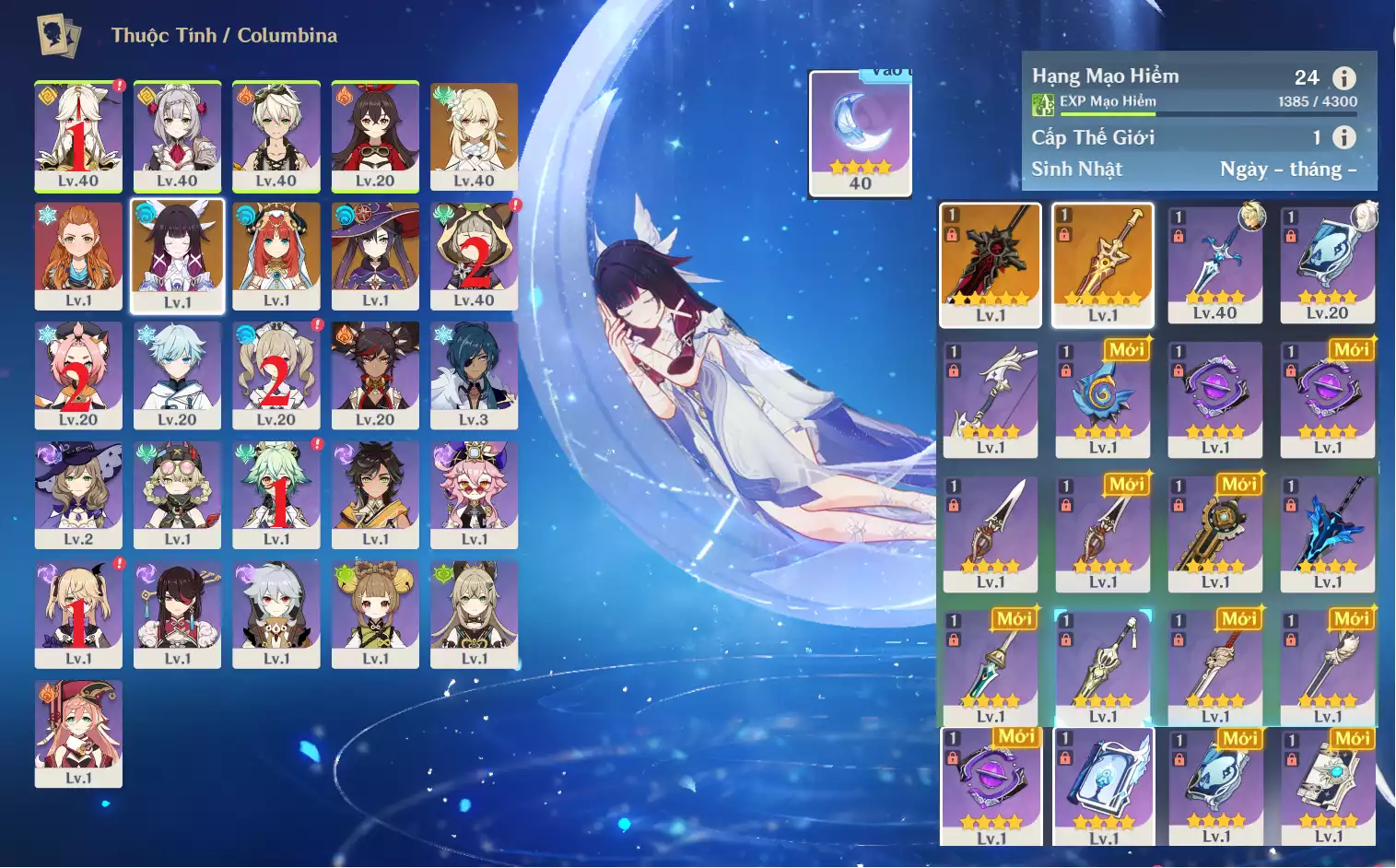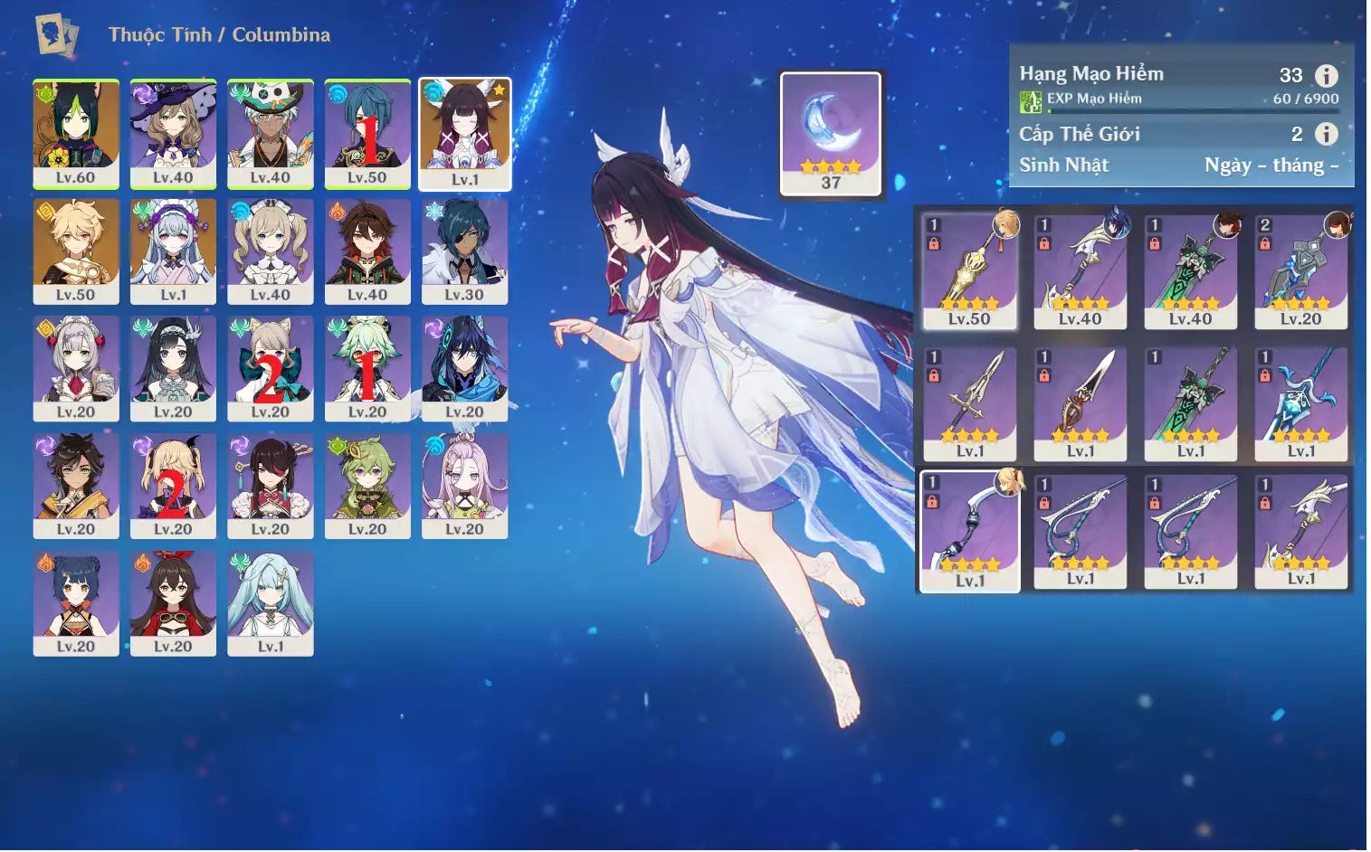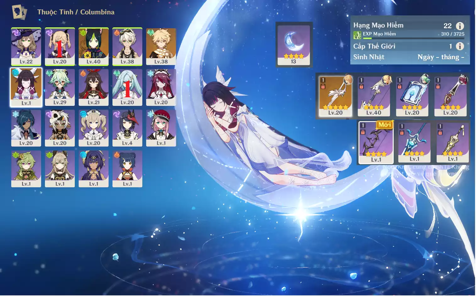 #359800 599,000đ 599,000đ AR level 5 Khu Vực asia Tướng 5* 1 Ar5: Nguyệt thần Columbina main NAM , banner nhân vật 2 trang , chưa set user _ chưa set sinh nhật Tướng : 1 Vũ khí : 0 Chi tiết