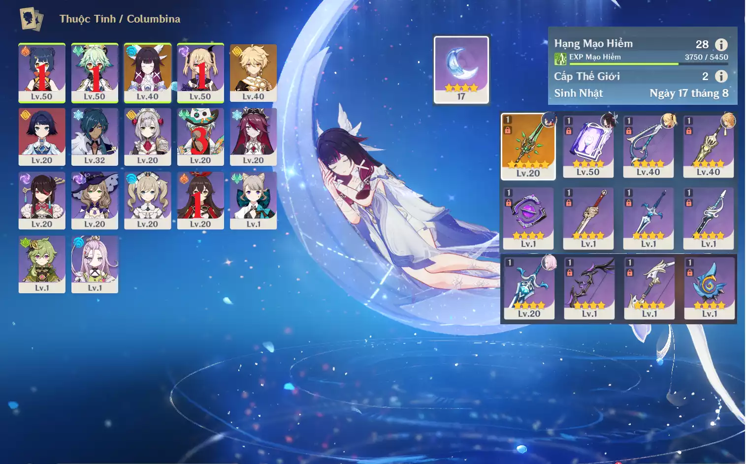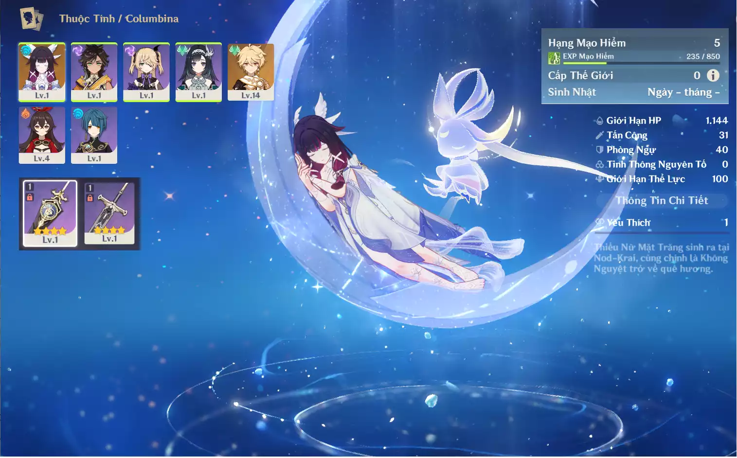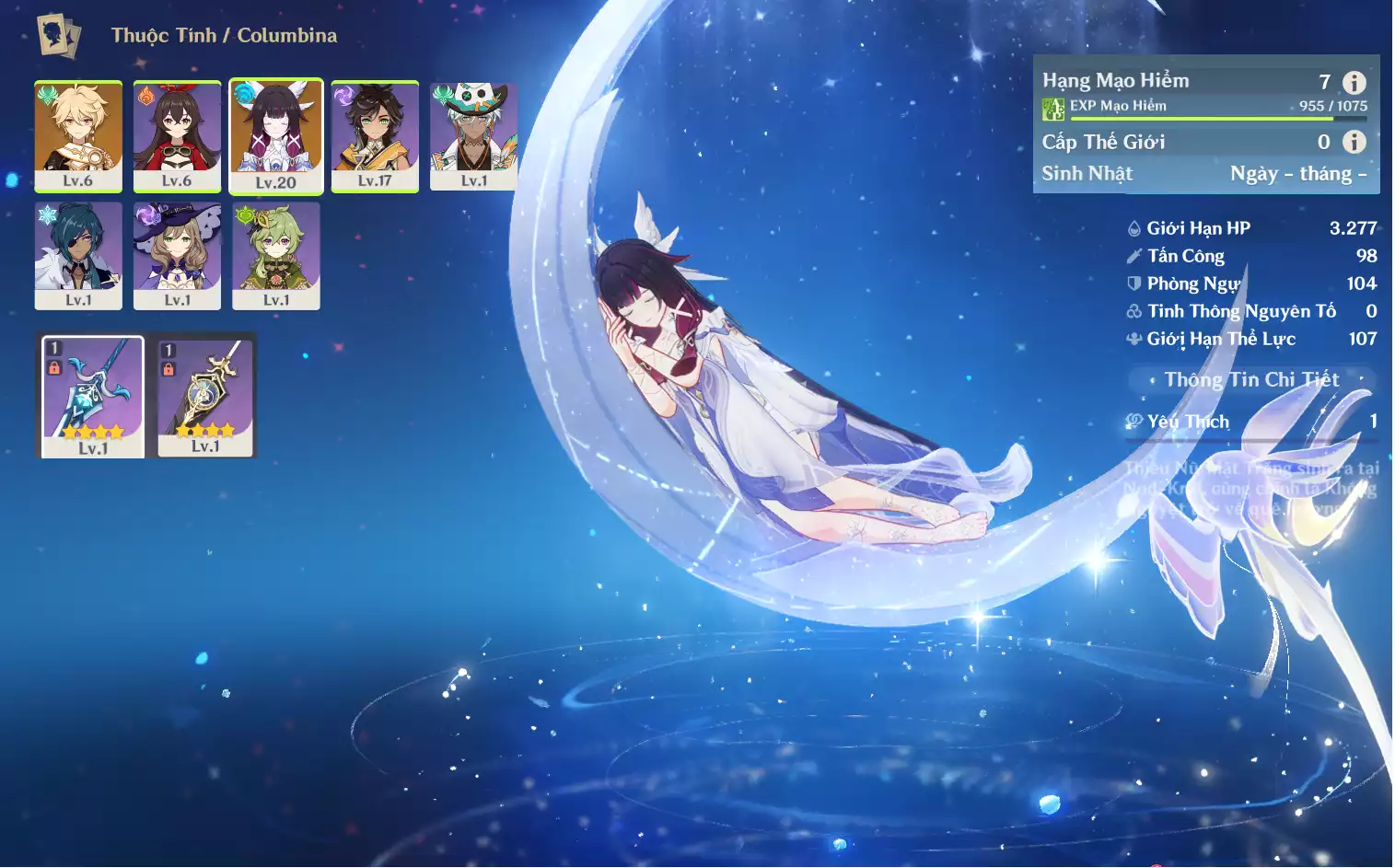 #359800 599,000đ 599,000đ AR level 5 Khu Vực asia Tướng 5* 1 Ar5: Nguyệt thần Columbina main NAM , banner nhân vật 2 trang , chưa set user _ chưa set sinh nhật Tướng : 1 Vũ khí : 0 Chi tiết