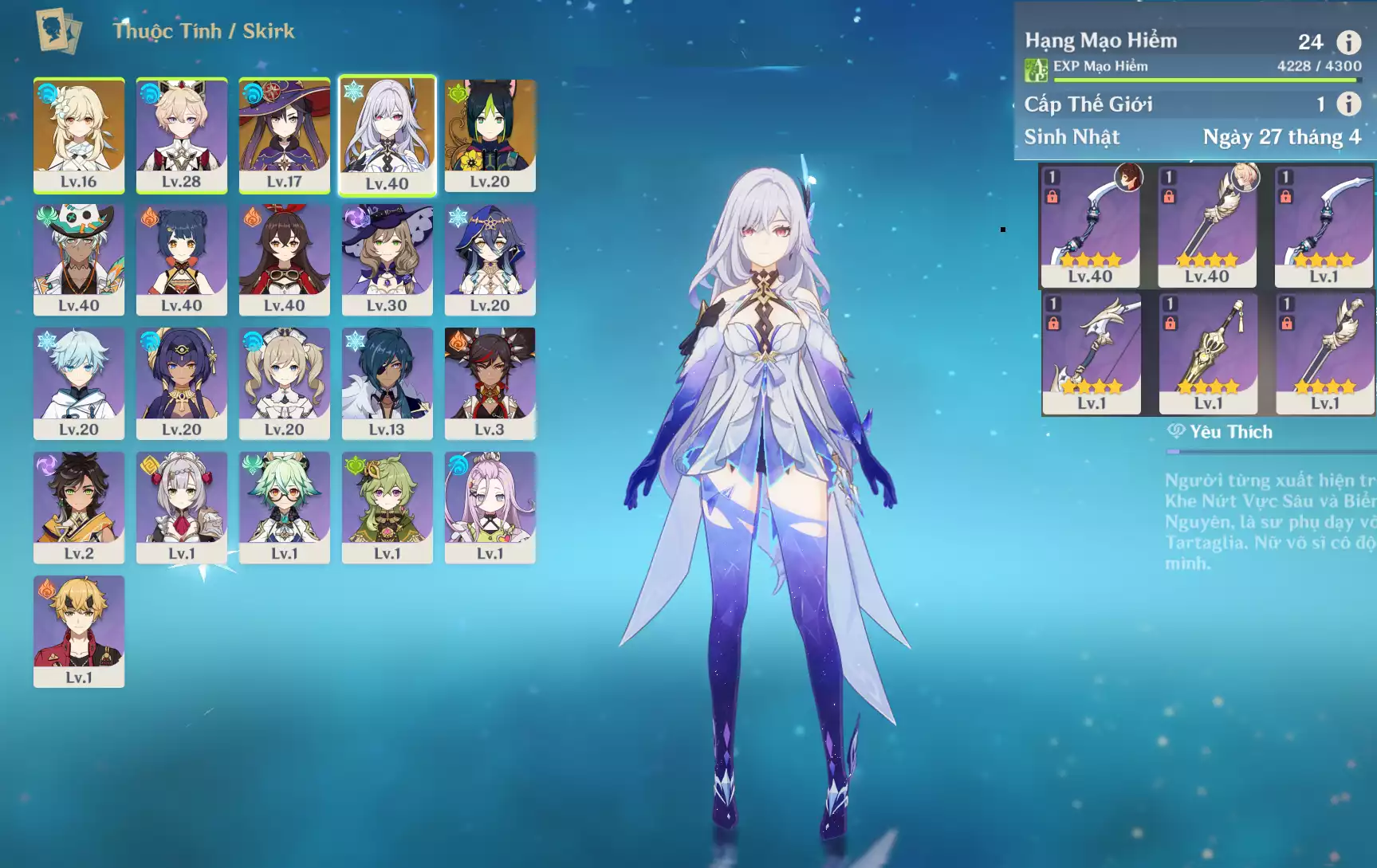 #356376 499,000đ 499,000đ AR level 24 Khu Vực asia Tướng 5* 3 Ar24 : Skirk + Tighnari + Mona _ banner nhân vật 30/90 ( chưa set user ) Tướng : 3 Vũ khí : 0 Chi tiết
