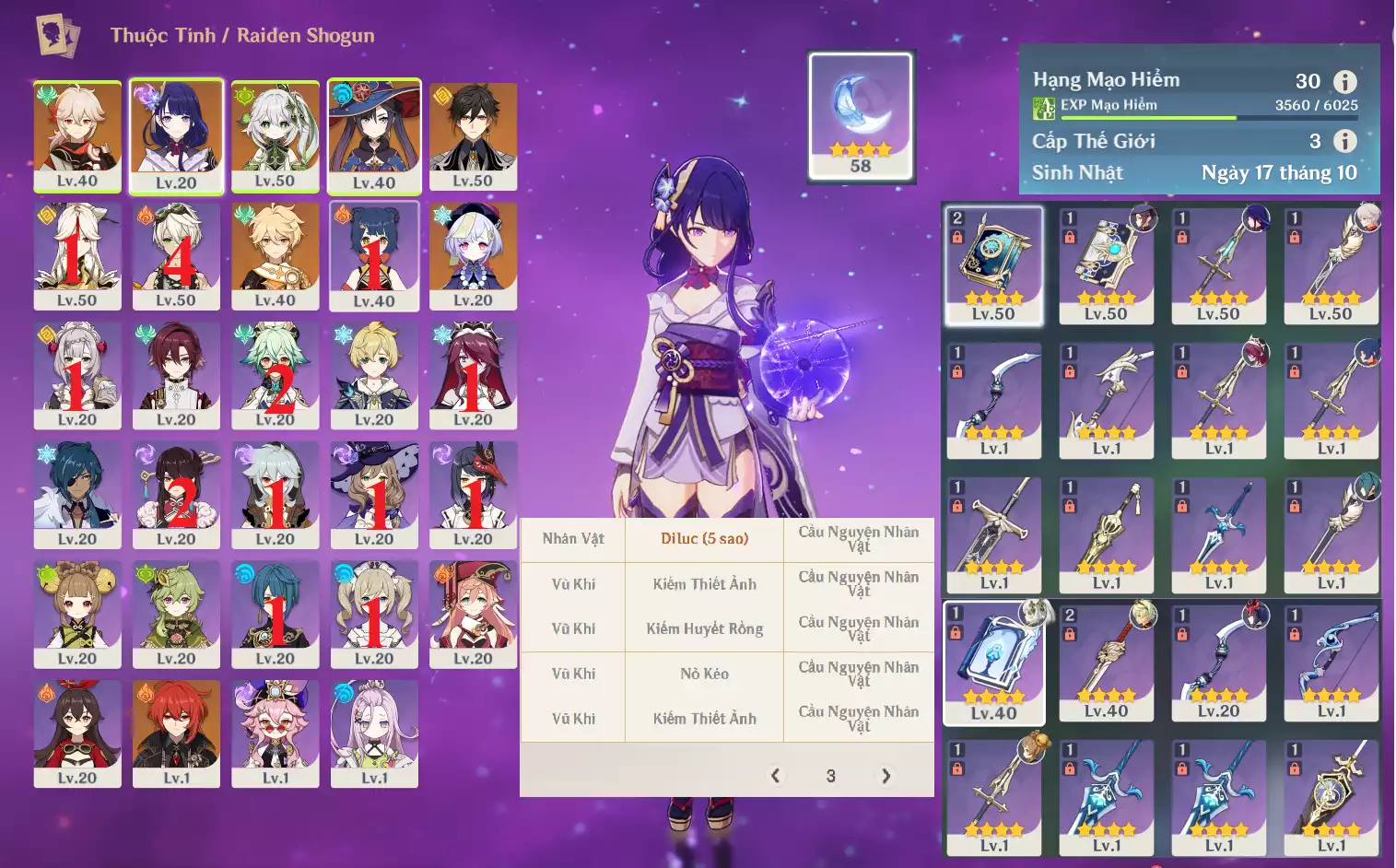 #356383 1,000,000đ 1,000,000đ AR level 30 Khu Vực asia Tướng 5* 8 VIP 3 thần Ar30: Raiden Shogun BAAL + Zhongli + Nahida + Kazuha + Mona QiQi Diluc bennetC4 main NAM , banner nhân vật ĐÃ LỆCH 3 trang, chưa set mail Tướng : 8 Vũ khí : 0 Chi tiết