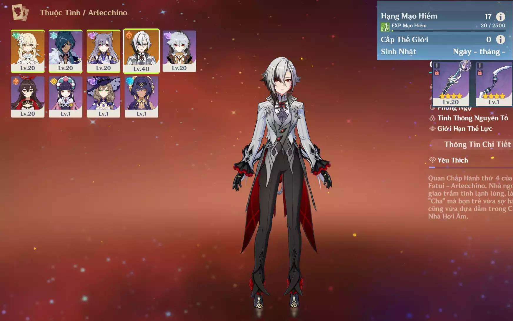 #357636 699,000đ 699,000đ AR level 37 Khu Vực asia Tướng 5* 5 Ar37 : Arlecchino + Yelan + Eula + XGPTĐ + DilucC1 + Tighnari _ banner nhân vật 1 trang. Tướng : 5 Vũ khí : 1 Chi tiết