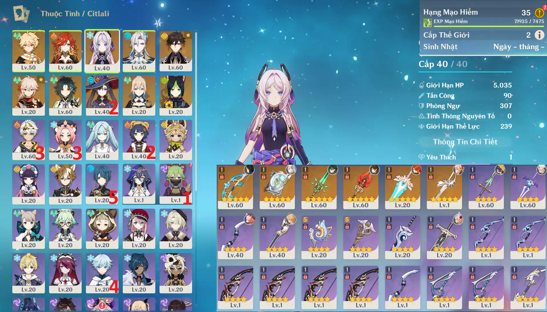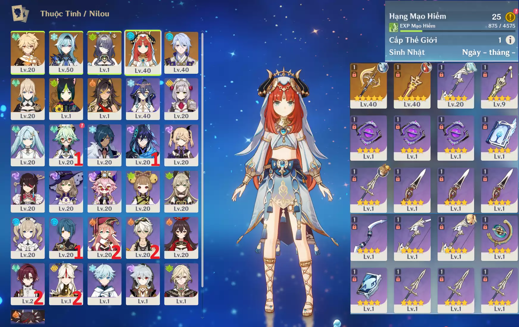 #356317 1,800,000đ 1,800,000đ AR level 25 Khu Vực asia Tướng 5* 7 Ar25 : Nilou + Trấn ( CKK-N) + Lauma + Ayato + Eula + Phán quyết + Tighnari Dehya Jean _ banner nhân vật 20/90 ( chưa set sinh nhật ) _ map zin 99% Tướng : 7 Vũ khí : 2 Chi tiết