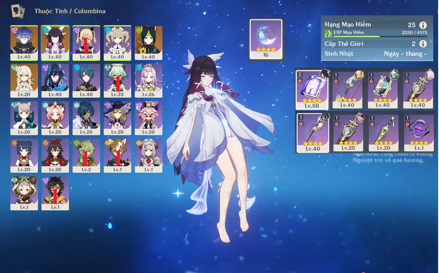 #361841 899,000đ 899,000đ AR level 25 Khu Vực asia Tướng 5* 3 Ar25: Columbina + Flins + Tighnari , banner nhân vật 2 trang , chưa set user _ chưa set sinh nhật Tướng : 3 Vũ khí : 0 Chi tiết