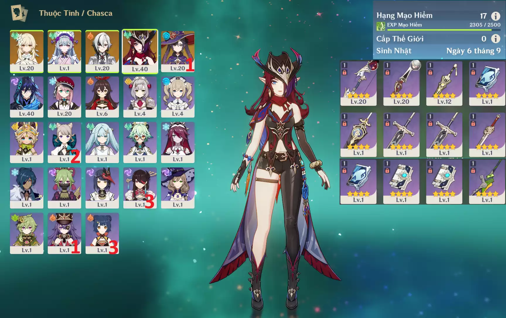 #356293 800,000đ 800,000đ AR level 17 Khu Vực asia Tướng 5* 4 Ar17 : Chasca + Arlecchino + Mizuki + MonaC1 _ banner nhân vật 30/90 _ thẻ tháng 29 ngày từ 7/10/2025 _ đã set user Tướng : 4 Vũ khí : 0 Chi tiết