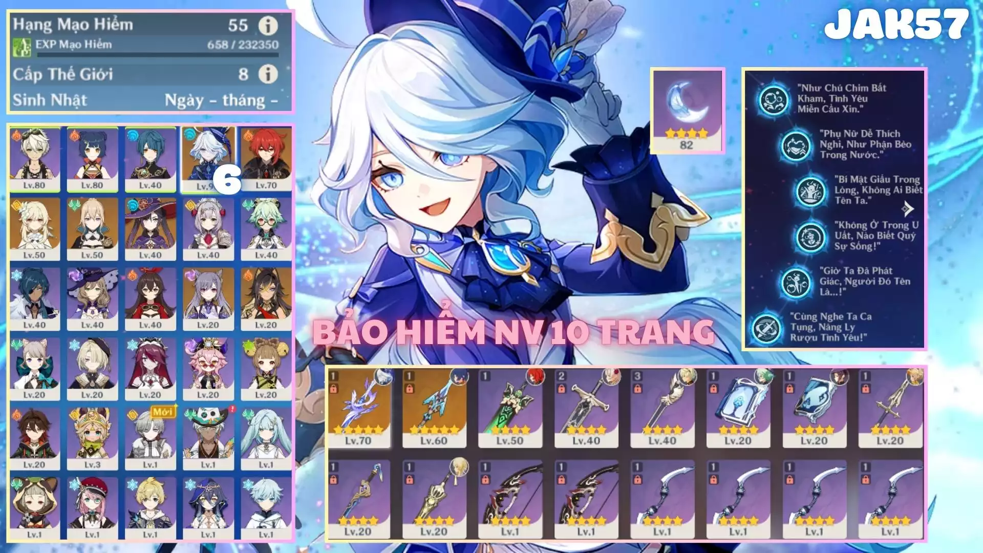 #359523 800,000đ 800,000đ AR level 55 Khu Vực asia Tướng 5* 1 furina c6 Tướng : 1 Vũ khí : 0 Chi tiết