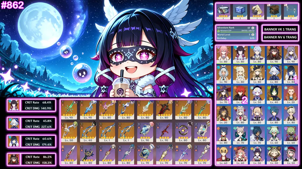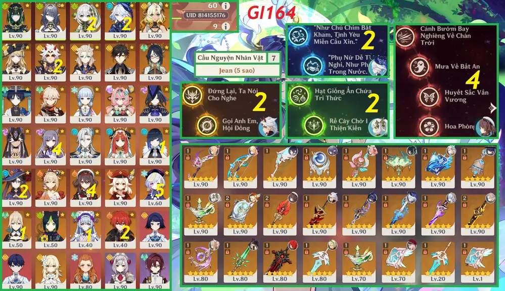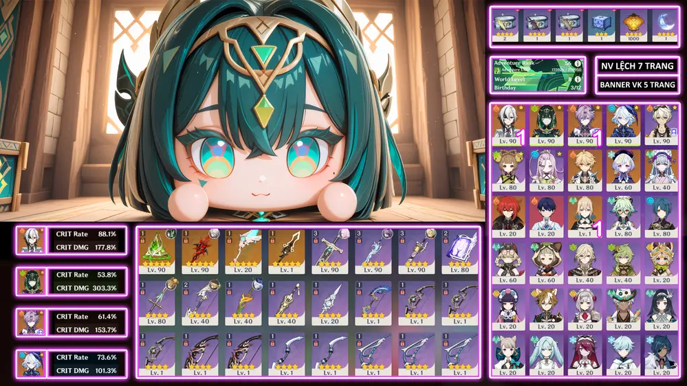 #359277 550,000đ 550,000đ AR level Khu Vực asia Tướng 5* 14 Columbina + Fu trấn + yelan c1 trấn kèm thêm vài char khác quá ngon lun ae Tướng : 14 Vũ khí : 10 Chi tiết