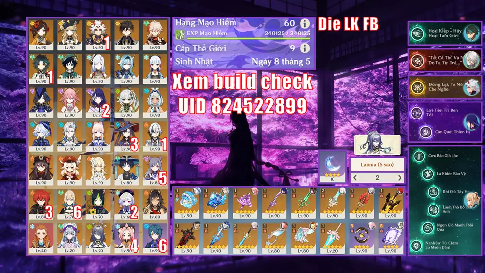 #355166 1,200,000đ 1,200,000đ AR level Khu Vực asia Tướng 5* 16 Check Build qua UID trong ảnh - Diluc CM6 Trấn ĐCCS kèm Skin Tướng : 16 Vũ khí : 10 Chi tiết