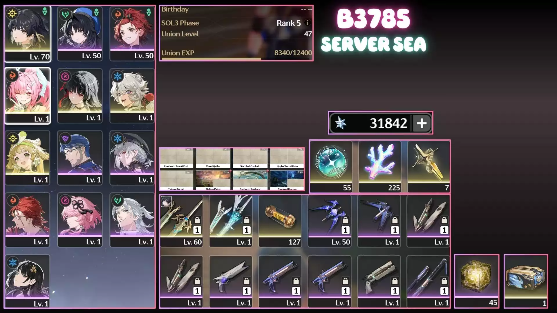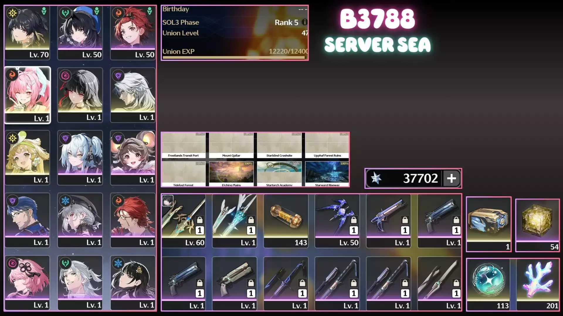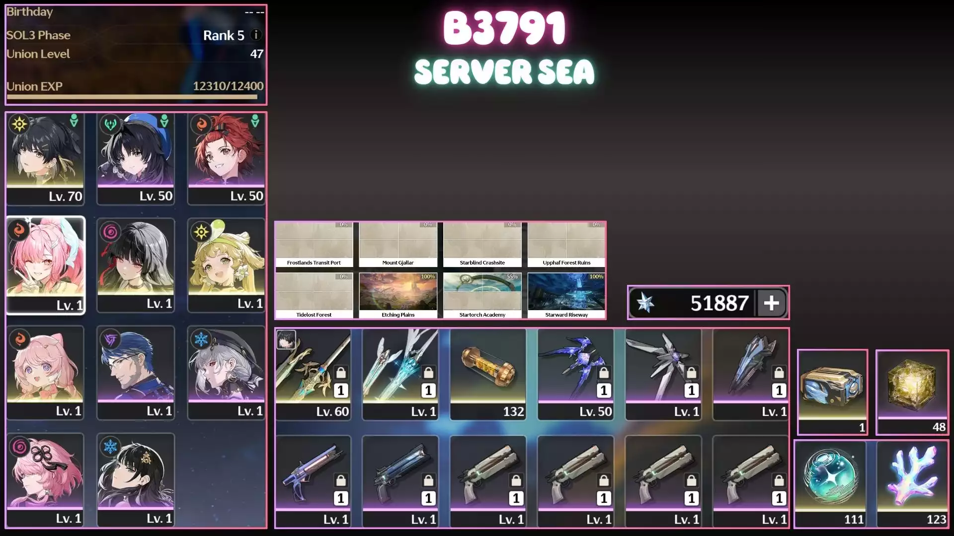 #14017 195,000đ AR level 47 Khu Vực asia Tướng 5* 2 Aemeath Trấn, Chisa ( 51k Đá, 123 San Hô ) Tướng : 2 Vũ khí : 1 Chi tiết