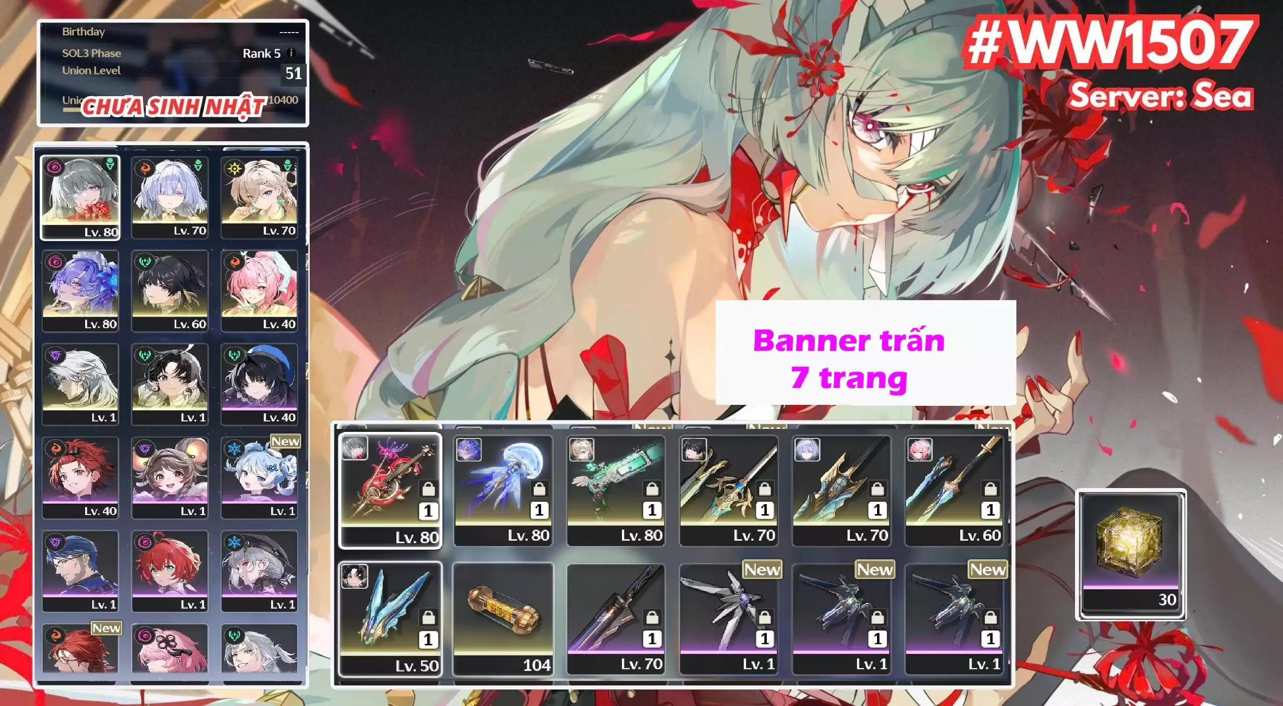 #14021 400,000đ AR level 51 Khu Vực asia Tướng 5* 5 [ ACC VIP ] WW1507 Phrolova R0A1 + Canta R0A1 + Lynae R0A1 + Mornye + Aemeath Tướng : 5 Vũ khí : 2 Chi tiết